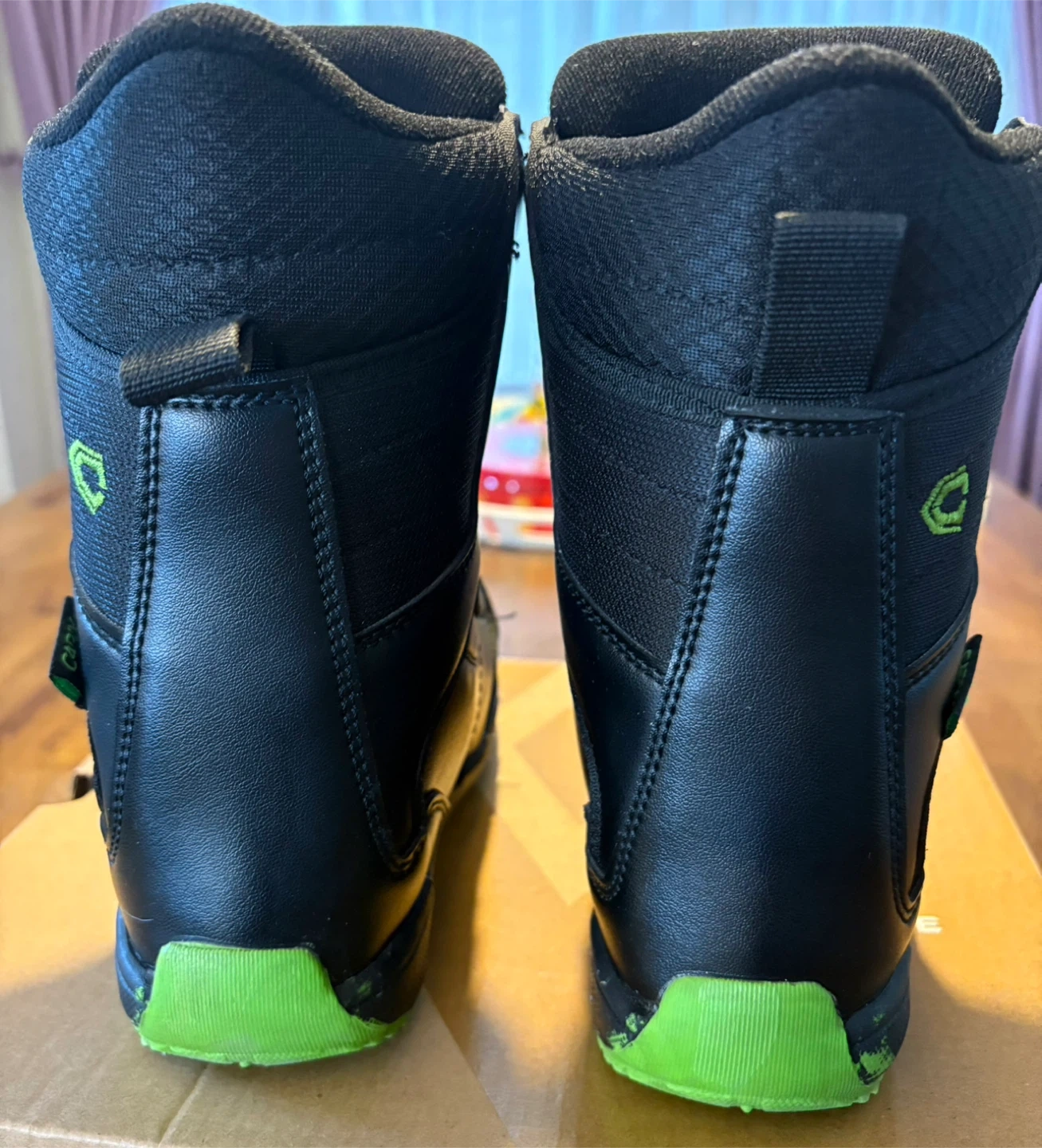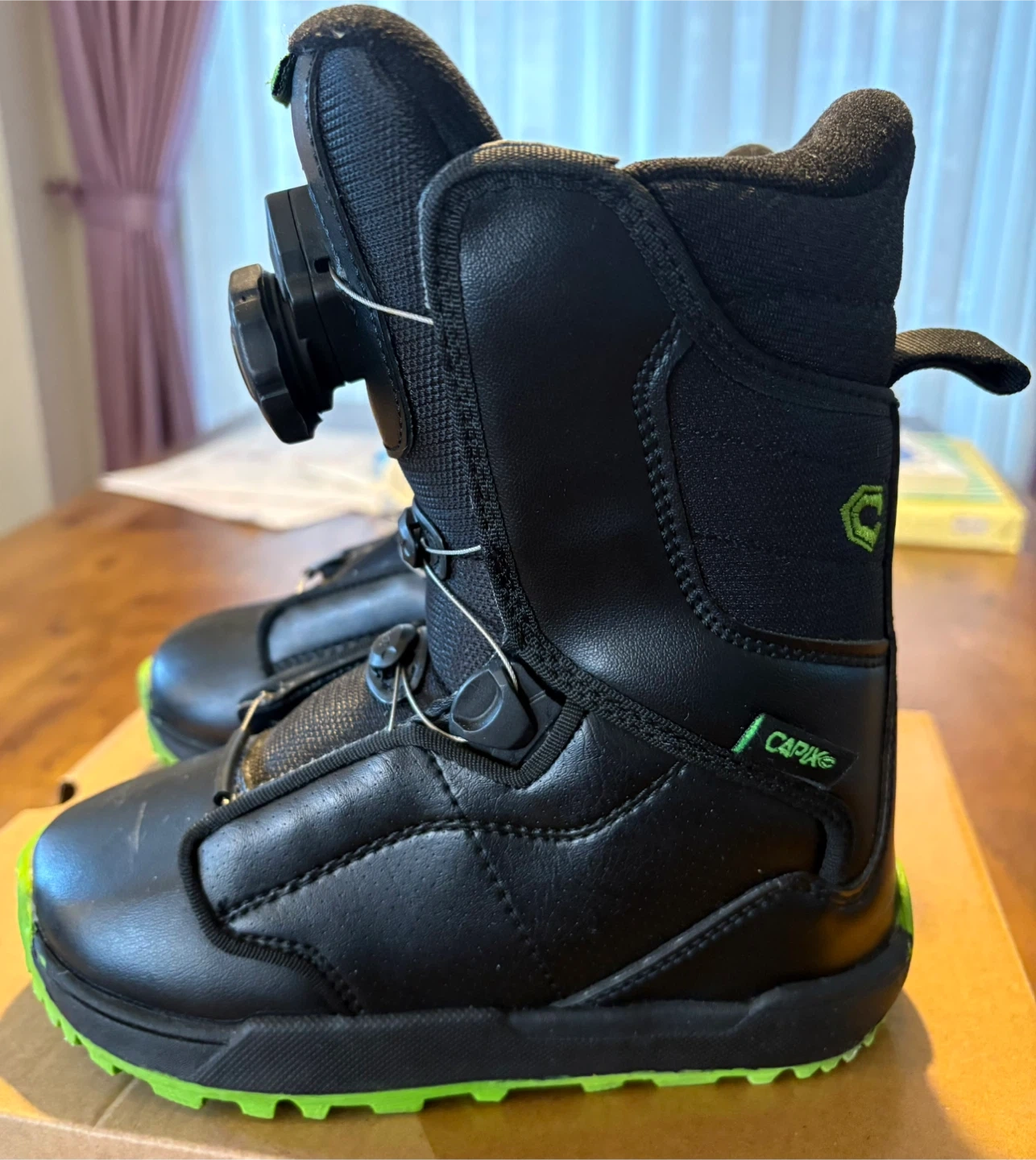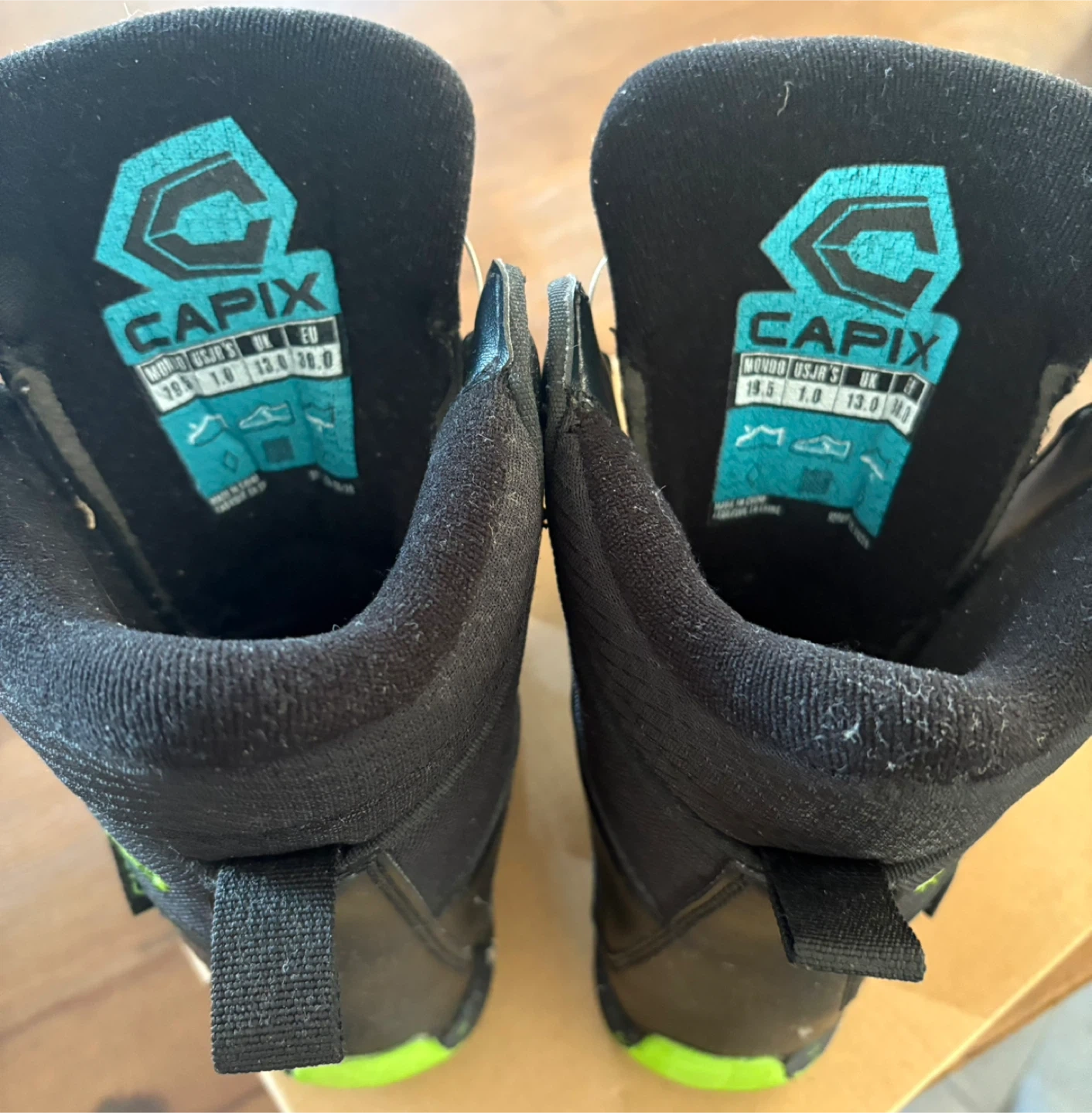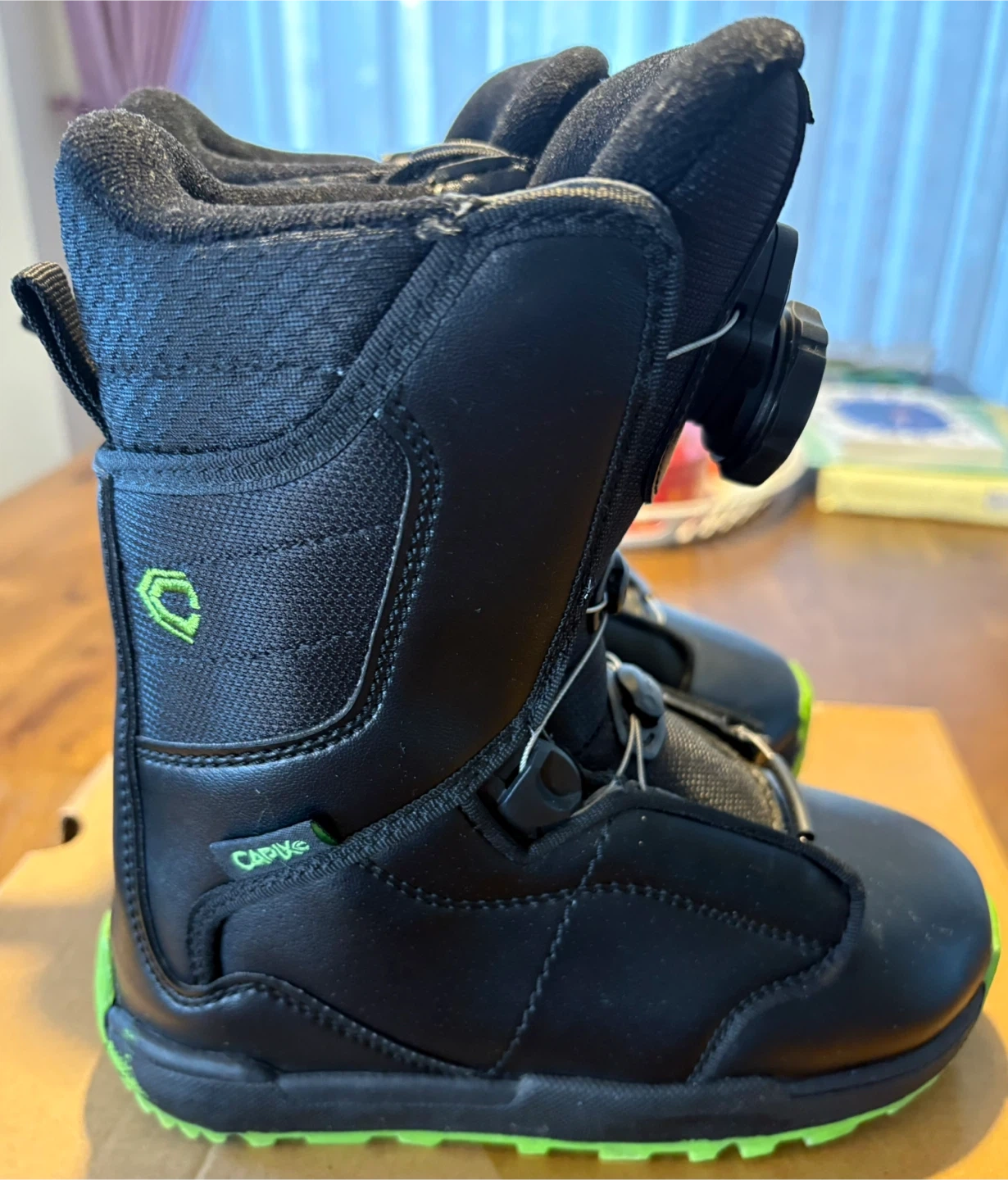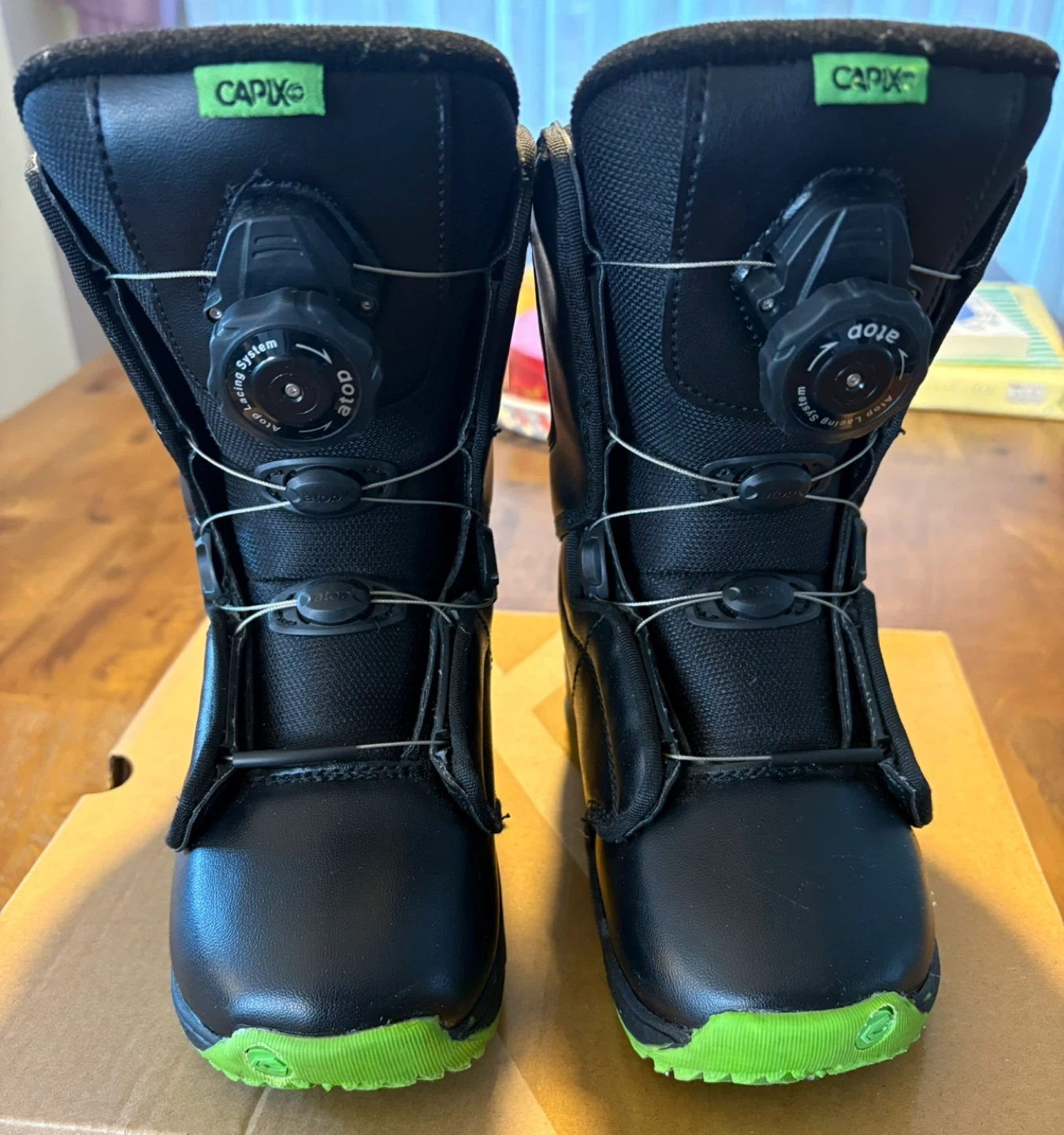 Selling Capix snowboard boots in black and green. These are a USJR size 1.0 . They feature a BOA lacing system for a secure and adjustable fit. Great boots for hitting the slopes!