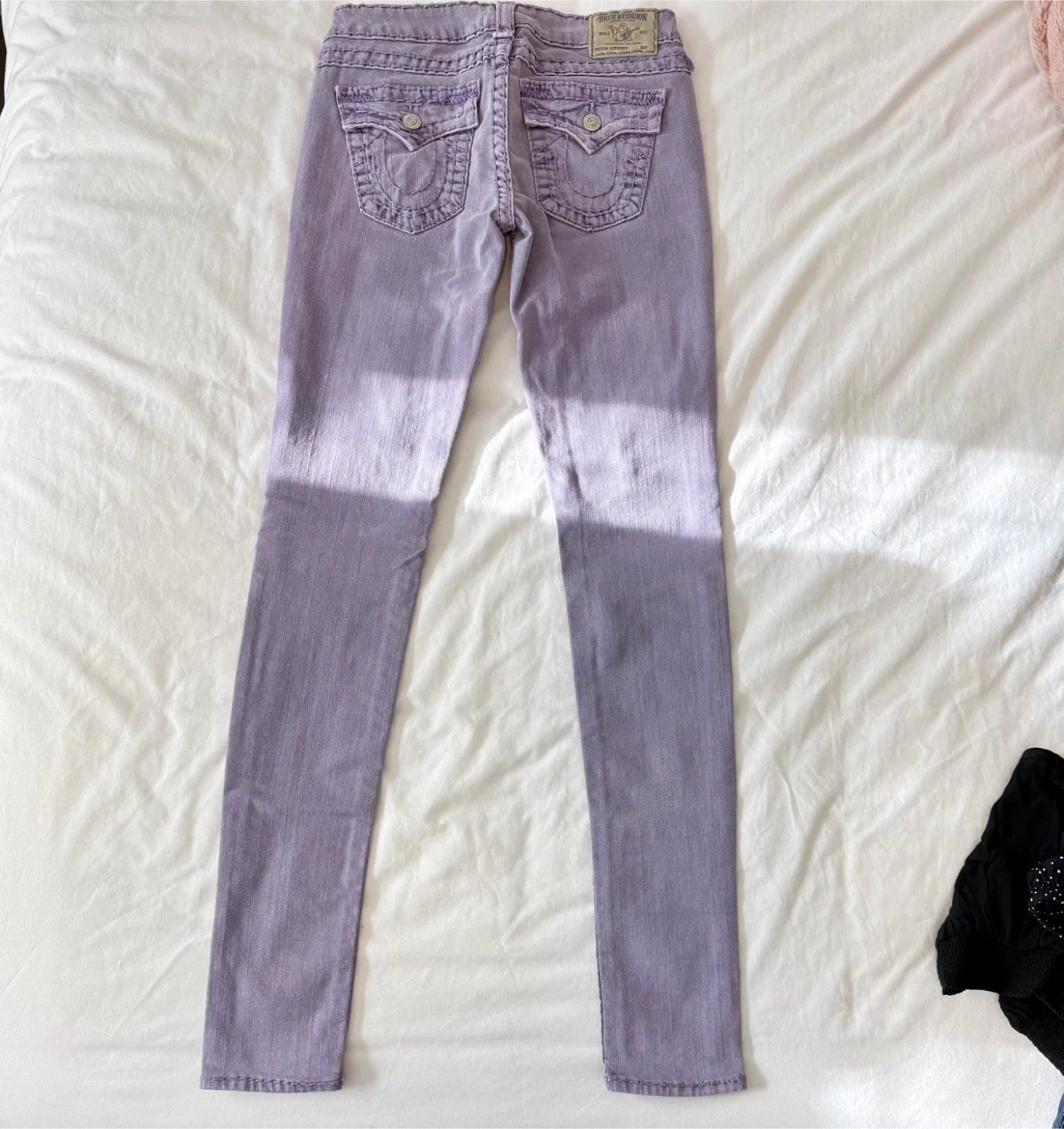 Selling True Religion Brand Jeans in a lovely light purple colour. These jeans are a size 29 and were made in the USA. They have the classic True Religion stitching and button detail. A great pair of jeans for any wardrobe!