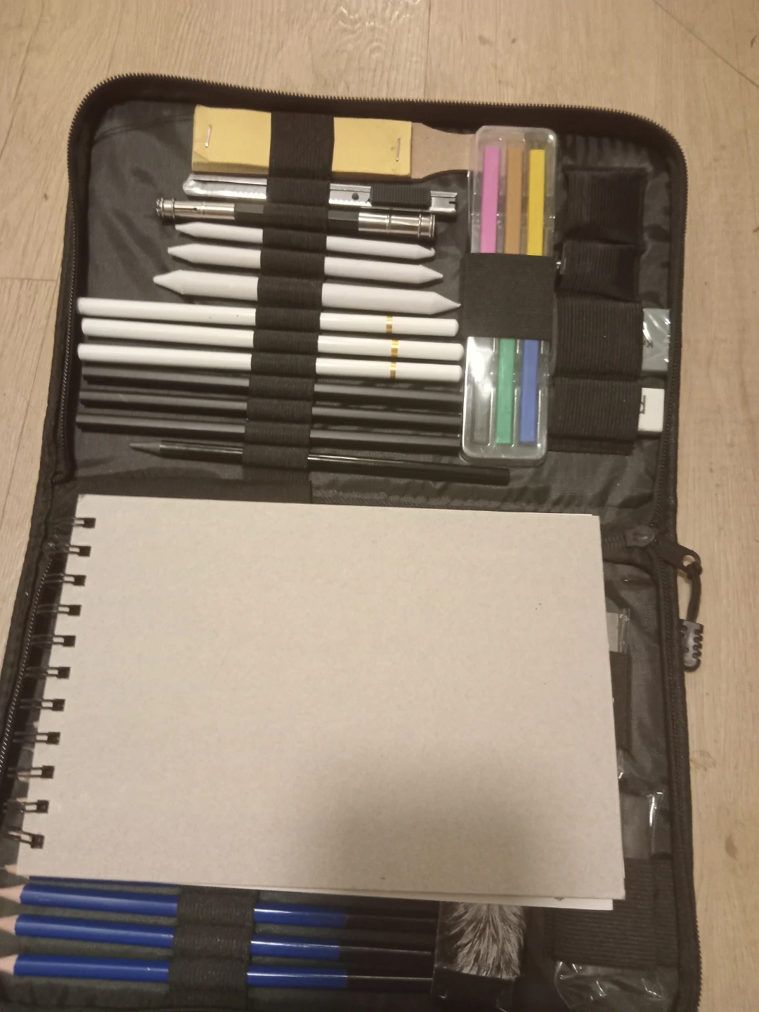 Selling a comprehensive drawing and sketching pencil set. Includes a variety of pencils, blending stumps, erasers, and colored pastels. Also comes with a spiral-bound sketchbook and a durable carrying case. Perfect for artists on the go!