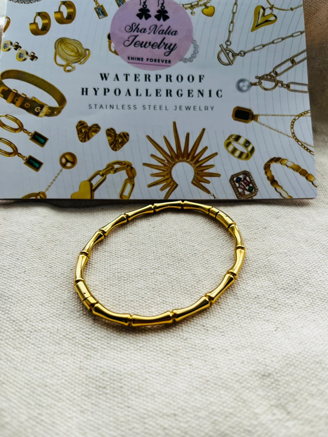 Selling a gold bamboo style bracelet from Sha Nalia Jewelry. It's waterproof and hypoallergenic stainless steel. A lovely everyday accessory!