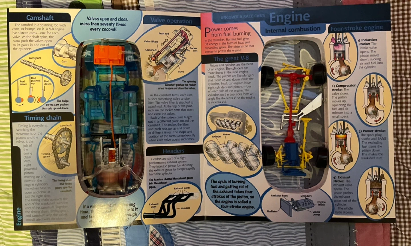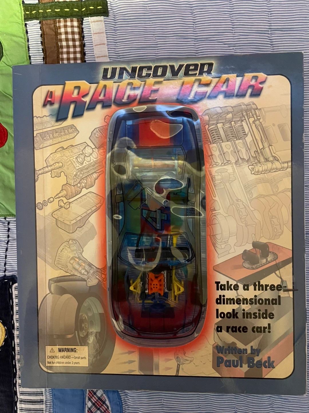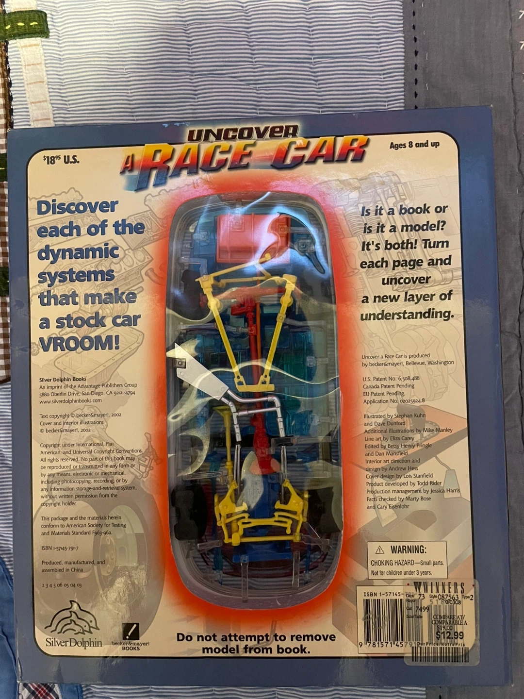 Selling the 'Uncover A Race Car' book which includes a buildable 3D model of a race car engine. Learn about the internal workings of a V8 engine. This interactive book is written by Paul Beck and published by Silver Dolphin Books. It provides a detailed look inside a race car! Great for kids aged 8 and up.