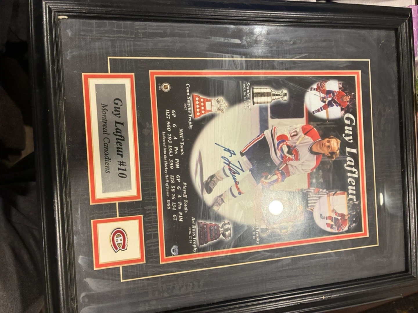 Selling a framed piece celebrating Montreal Canadiens legend Guy Lafleur, featuring his photo and stats. Includes multiple trophies and his autograph. A great item for any hockey fan!