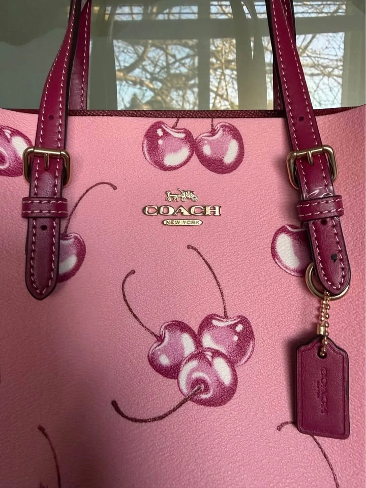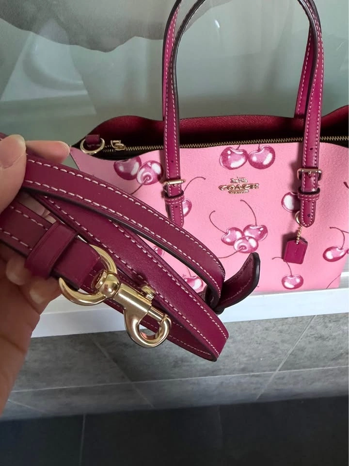Dimensions: Length: 9.75", Height: 7.5", Width: 4.75". Coach Mollie Tote Bag 25 in cherry pink with gold hardware. Comes with the long cross body strap. 100% authentic. Original retail price was $460.