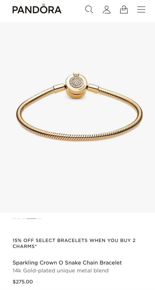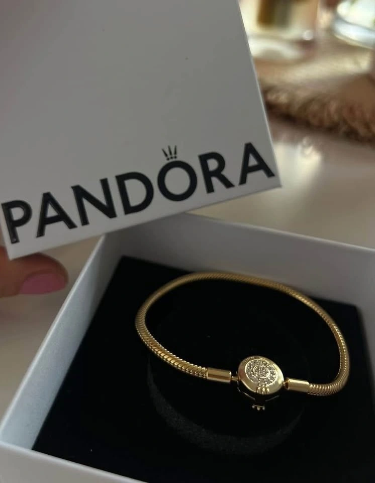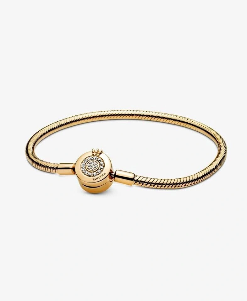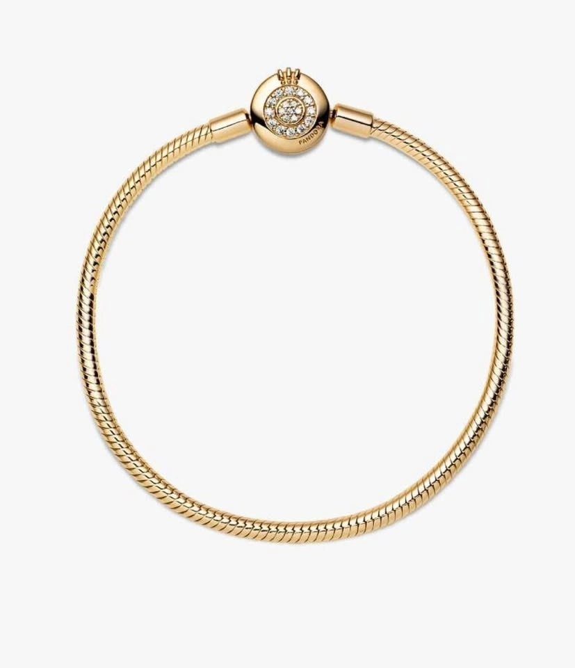 Gold Pandora bracelet. Wrist size: 18cm. Sparkling Crown O Snake Chain Bracelet. 14k Gold-plated unique metal blend. A sparkling version of Pandora's bestselling bracelet. With a glittering cubic zirconia pavé clasp shaped like the iconic Pandora O, this 14k gold-plated snake chain makes a sleek statement on its own – or styled with your favourite charms. Retails for $275 plus tax on website!