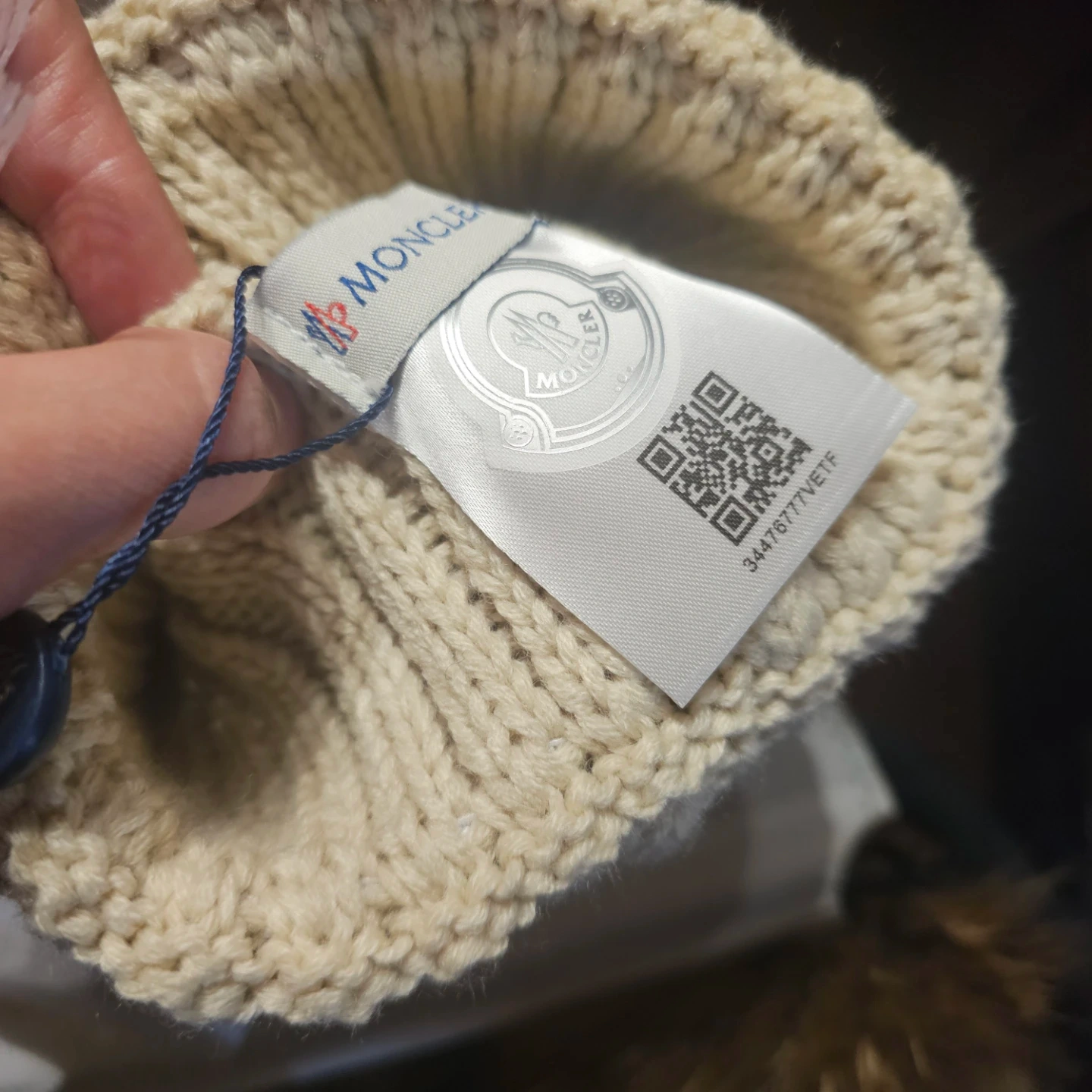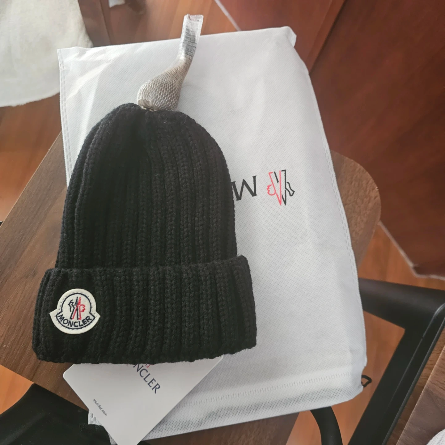 Selling a black Moncler beanie with a large, natural fur pom pom. It's made from a thick, ribbed knit material. Comes with the original dust bag and tag. A stylish and warm accessory!