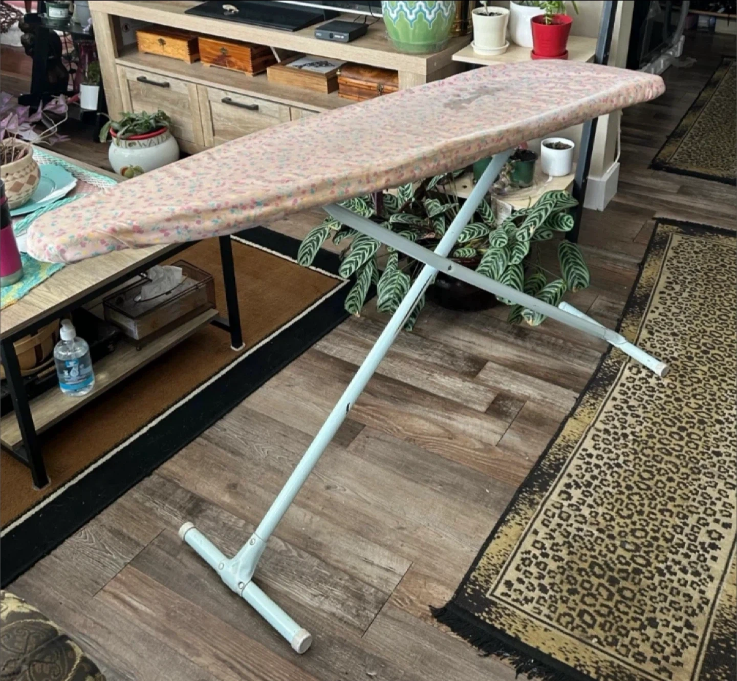Selling a standard ironing board with a floral print cover. Sturdy metal legs provide a stable surface for ironing. Folds flat for easy storage. Great for everyday laundry needs!