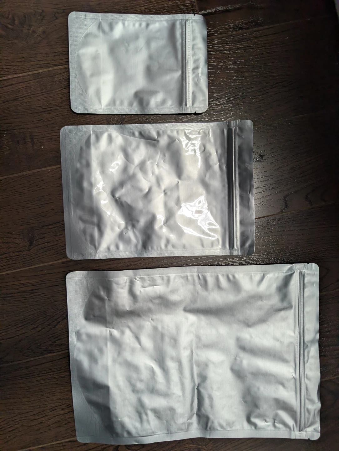 Three set of pouches perfect for storing dry goods or other items. They come in varying sizes and offer a secure zipper seal to keep contents fresh. Great for organization or travel!