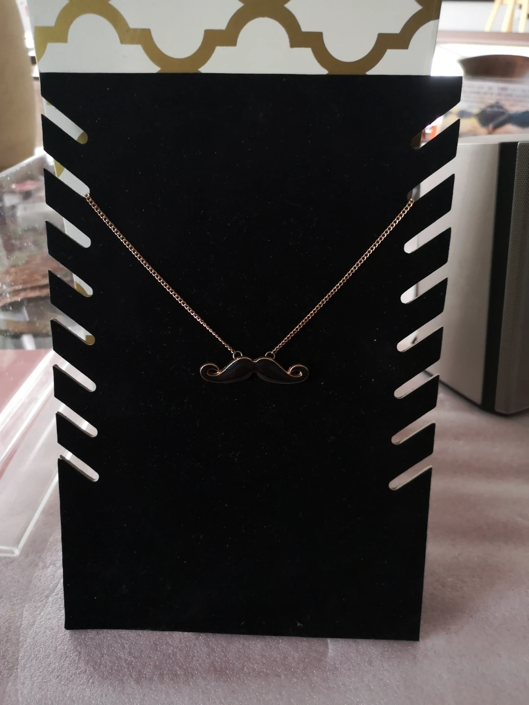 This is a used, charming necklace featuring a delicate chain and a fun moustache pendant, perfect for adding a whimsical touch to any outfit. The necklace boaed is in good condition, ready to be worn and enjoyed.