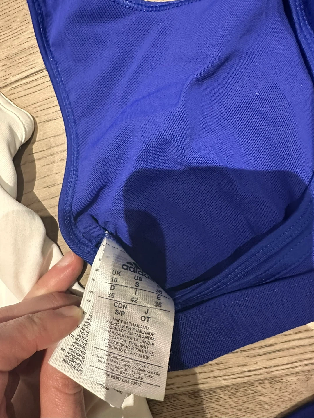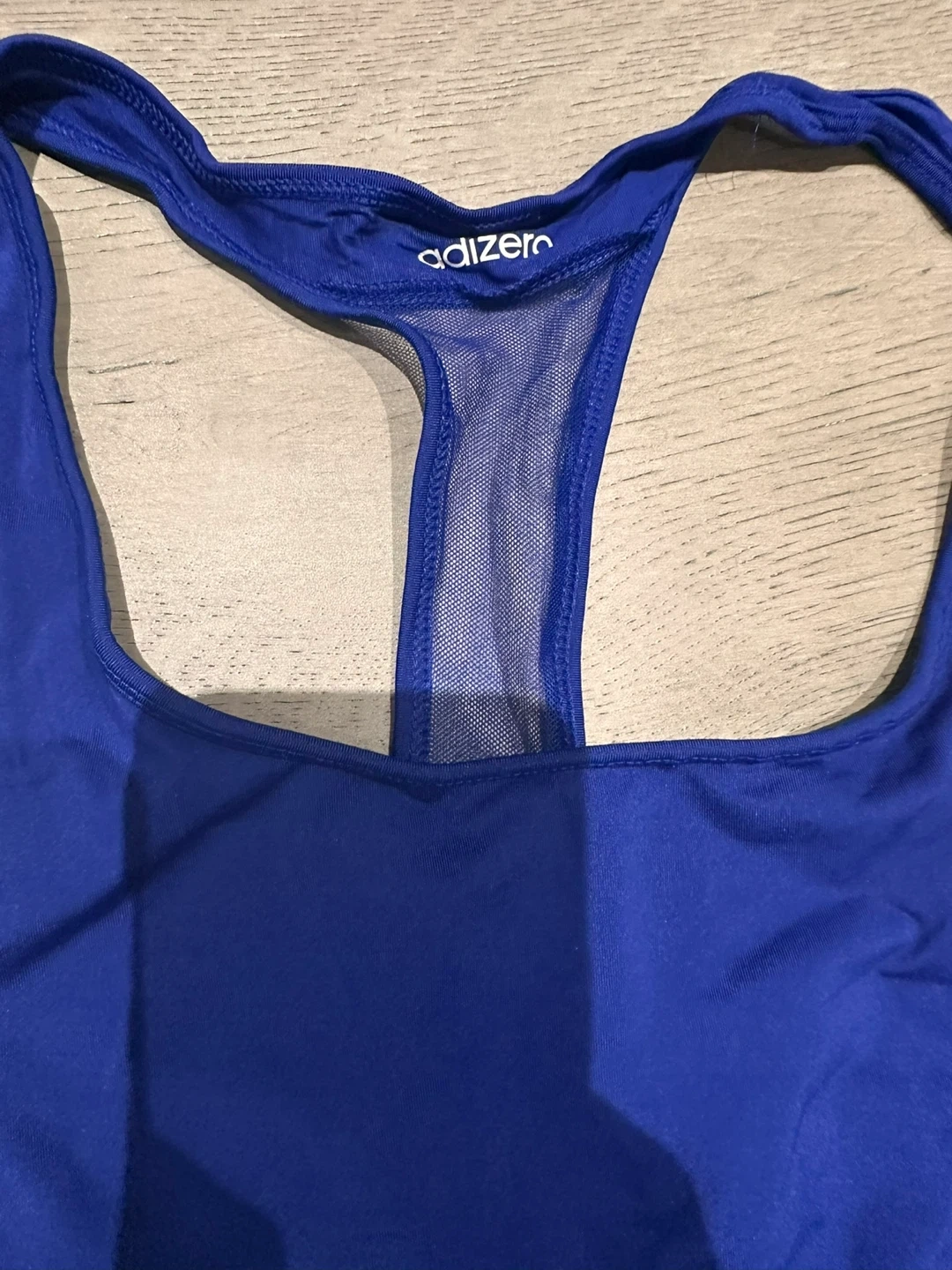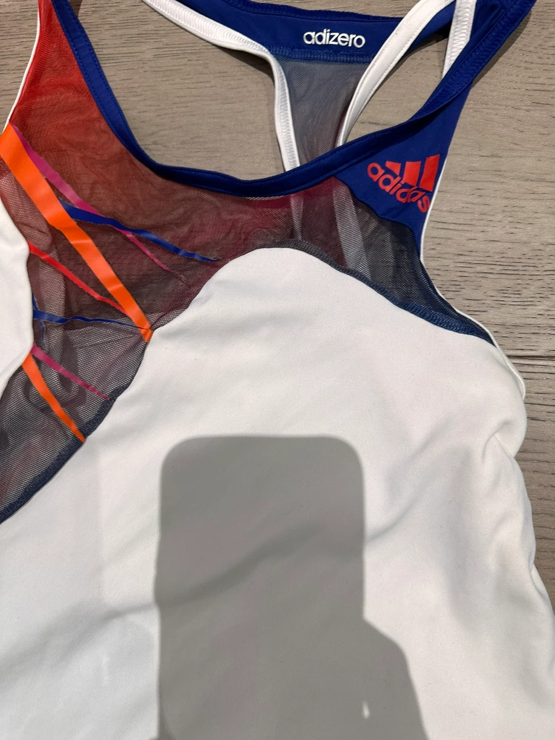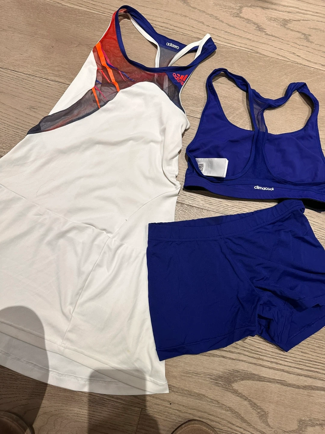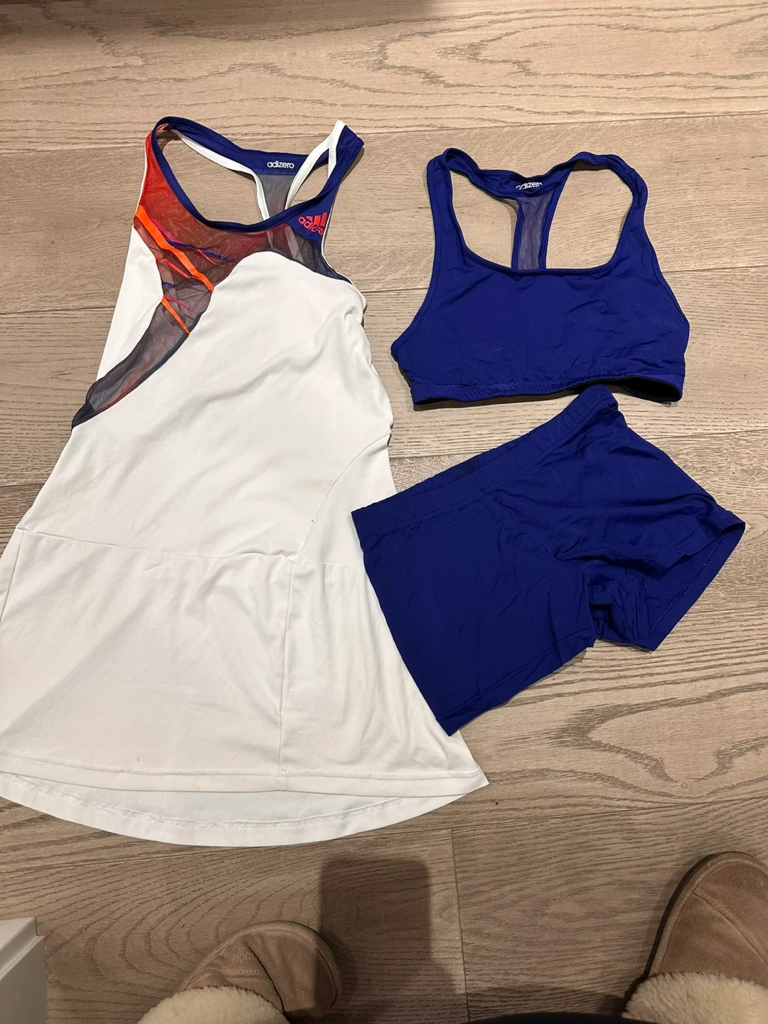 This Adidas Adizero tennis set includes a white dress with mesh accents and a blue sports bra with matching blue shorts. Made with climacool fabric for breathability.