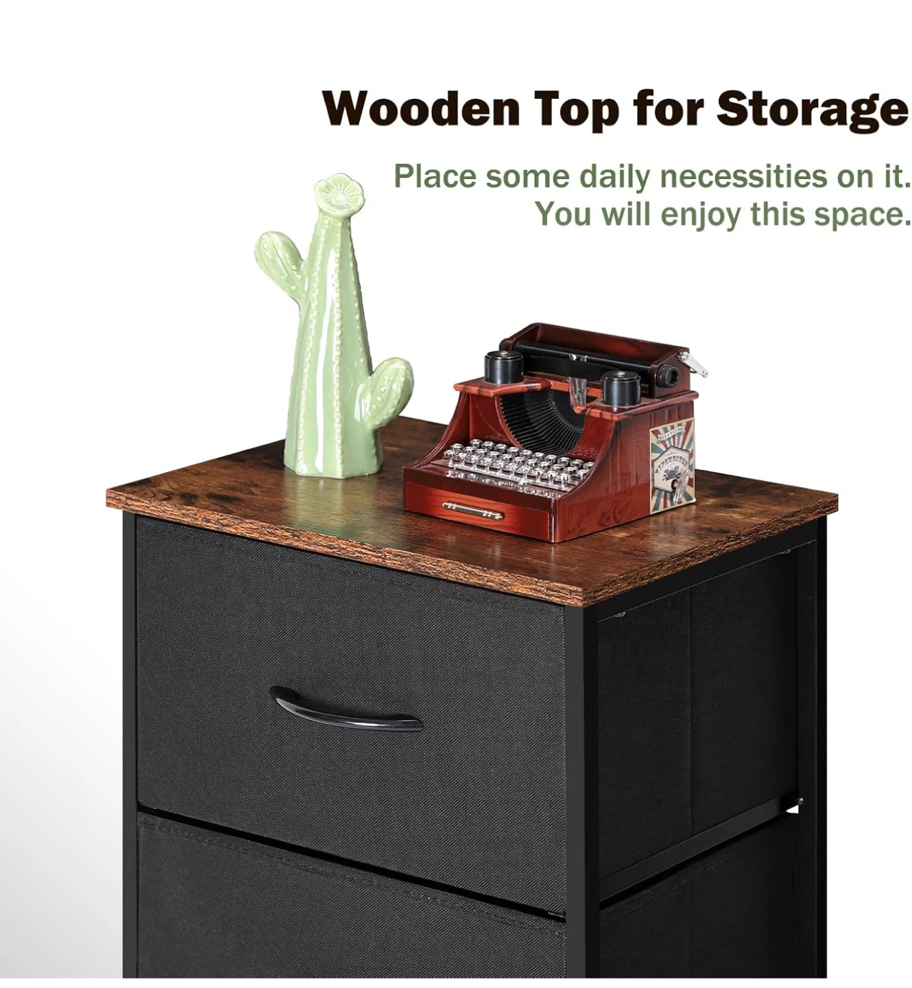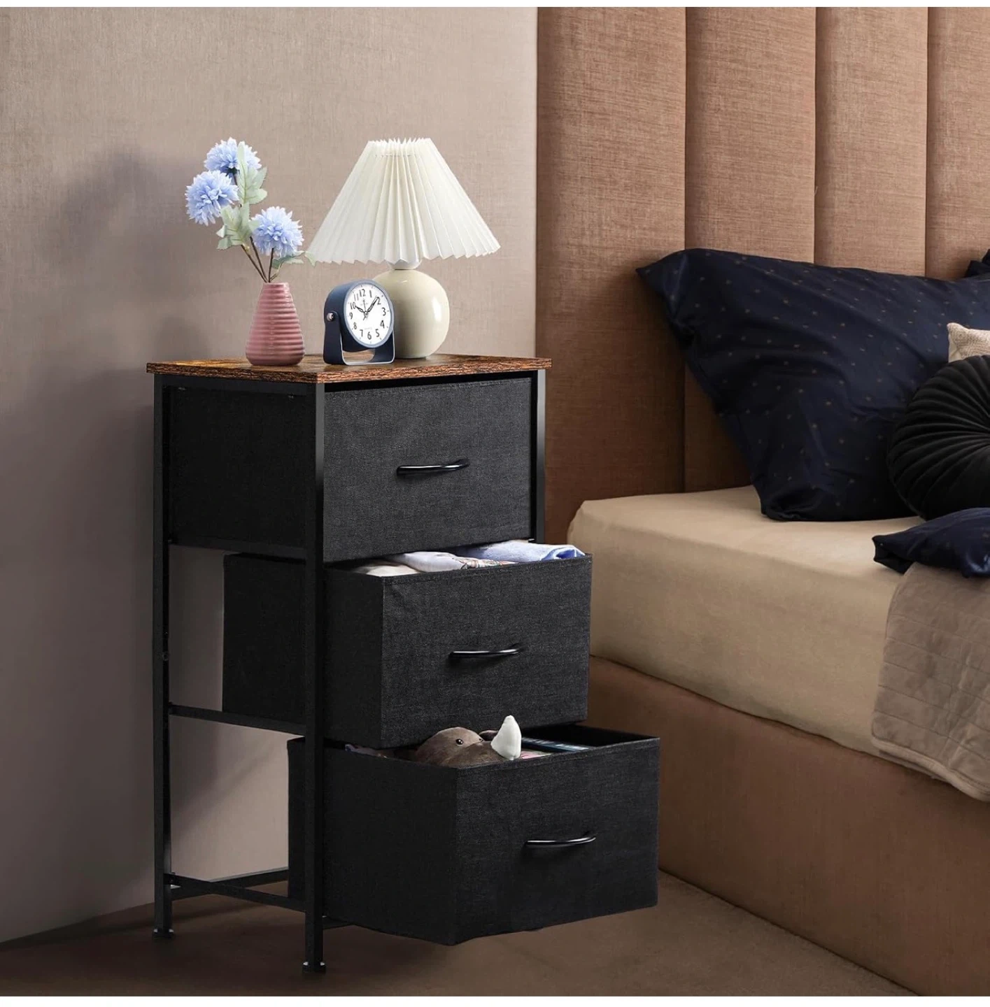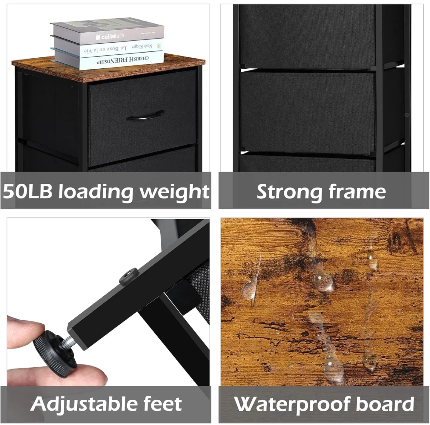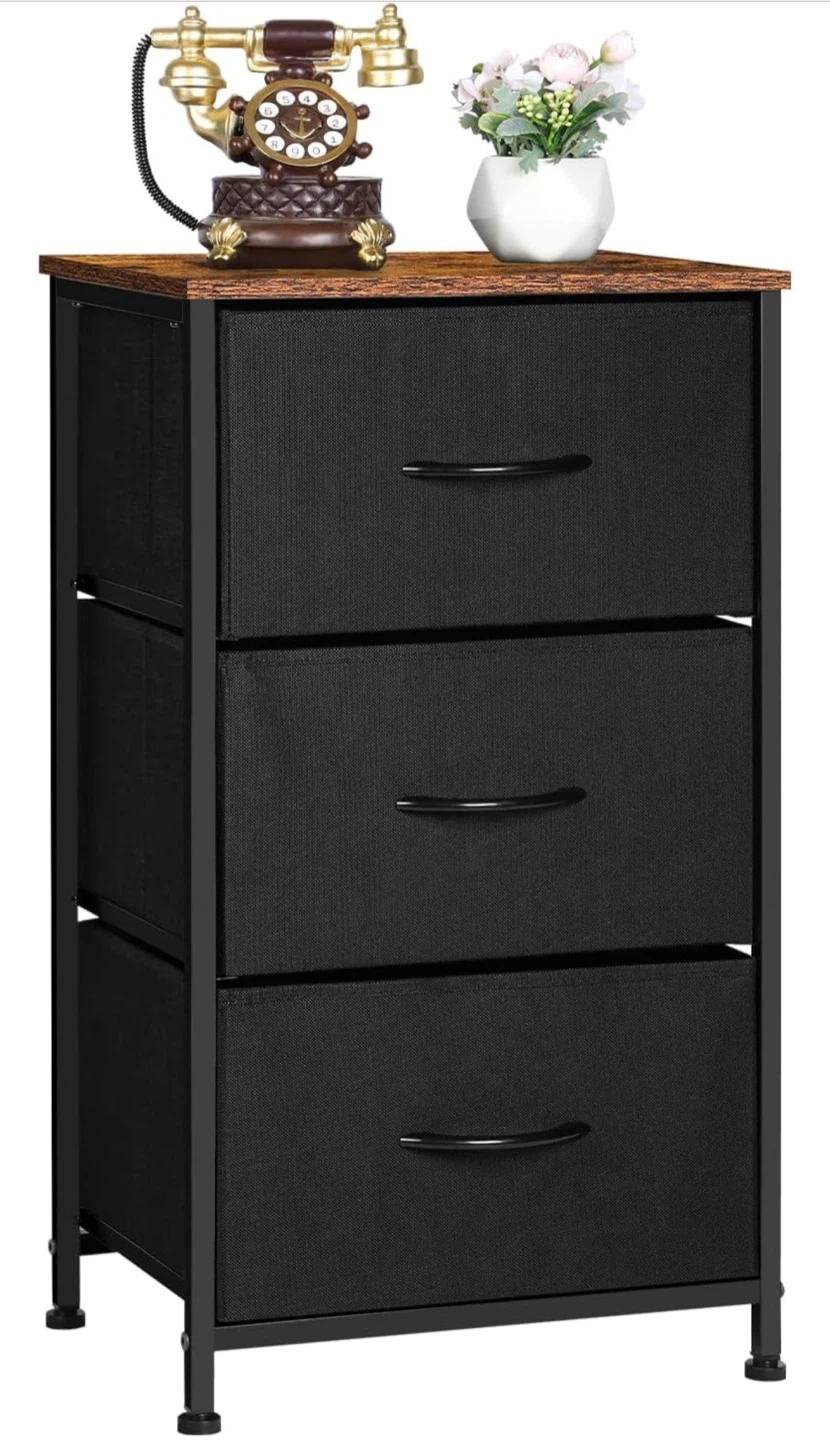 This 3-drawer fabric dresser offers convenient storage with a stylish wooden top. It features a strong frame and adjustable feet for stability. The top board is waterproof and can hold up to 50lbs. Perfect for organizing your space!