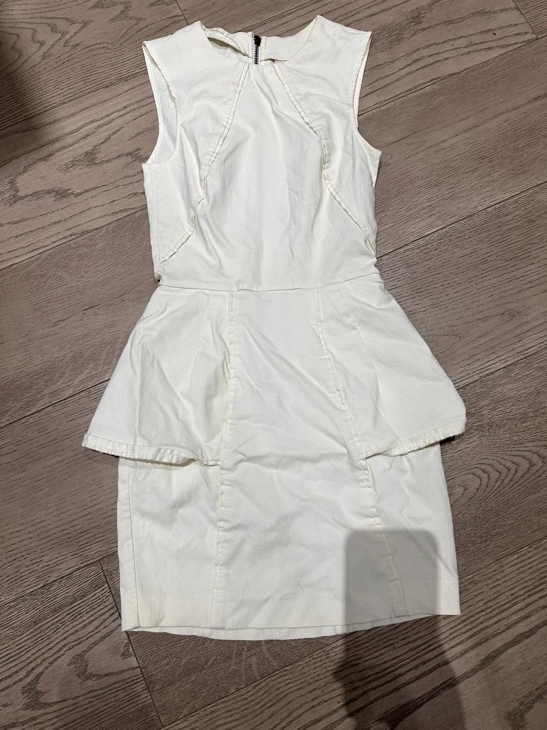 White sleeveless peplum dress with a zip closure.