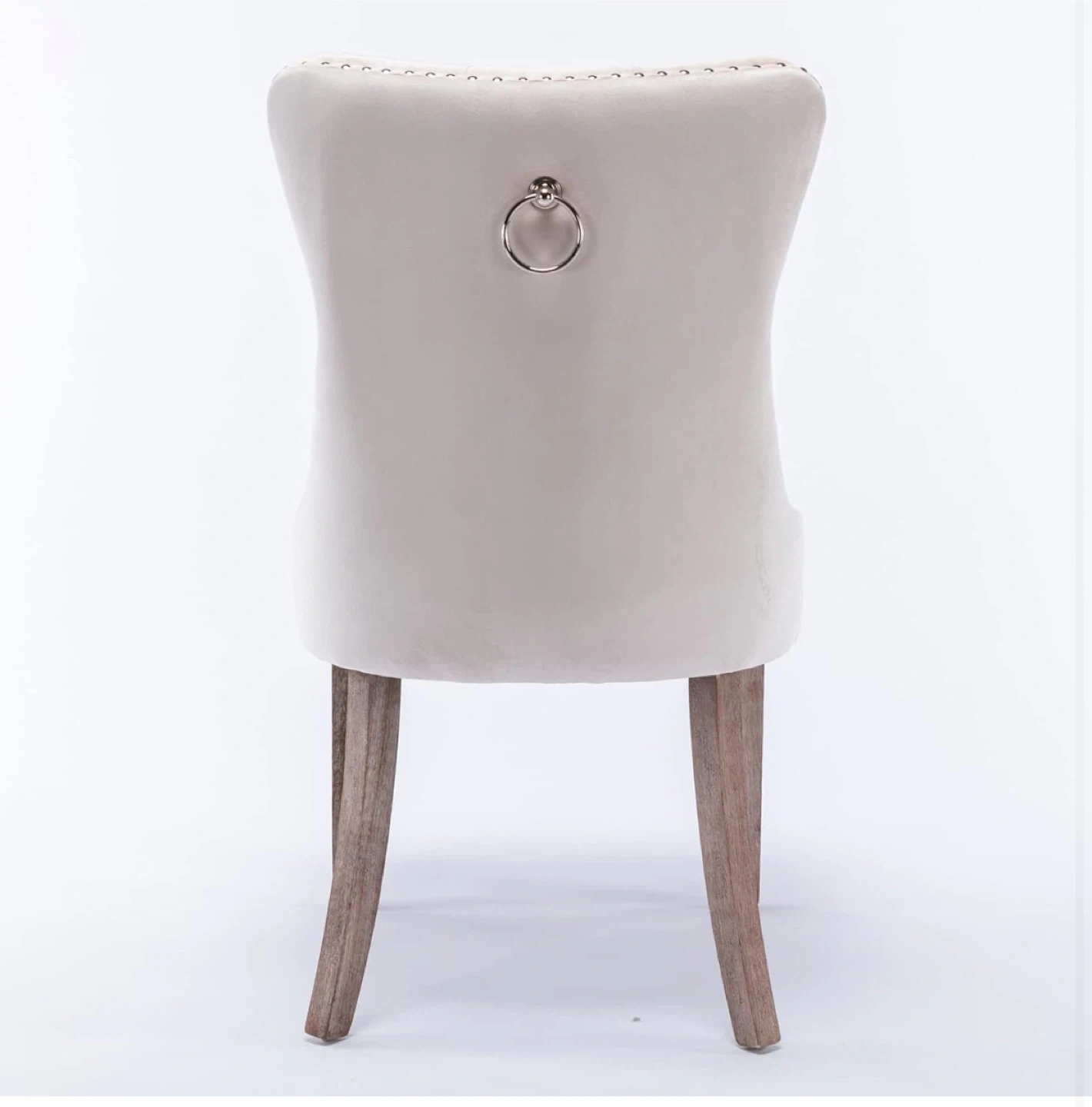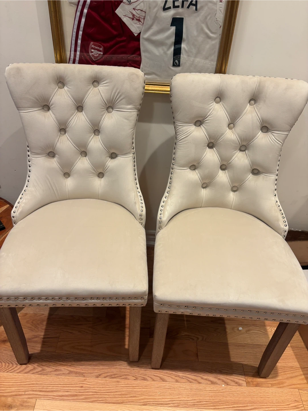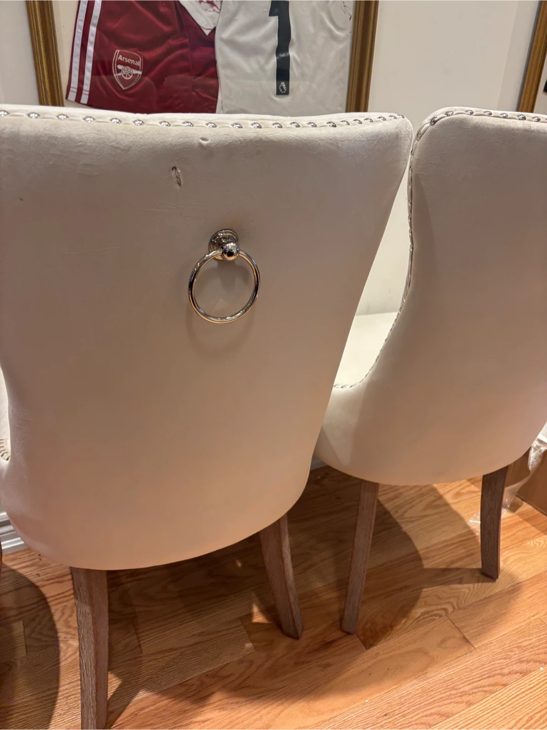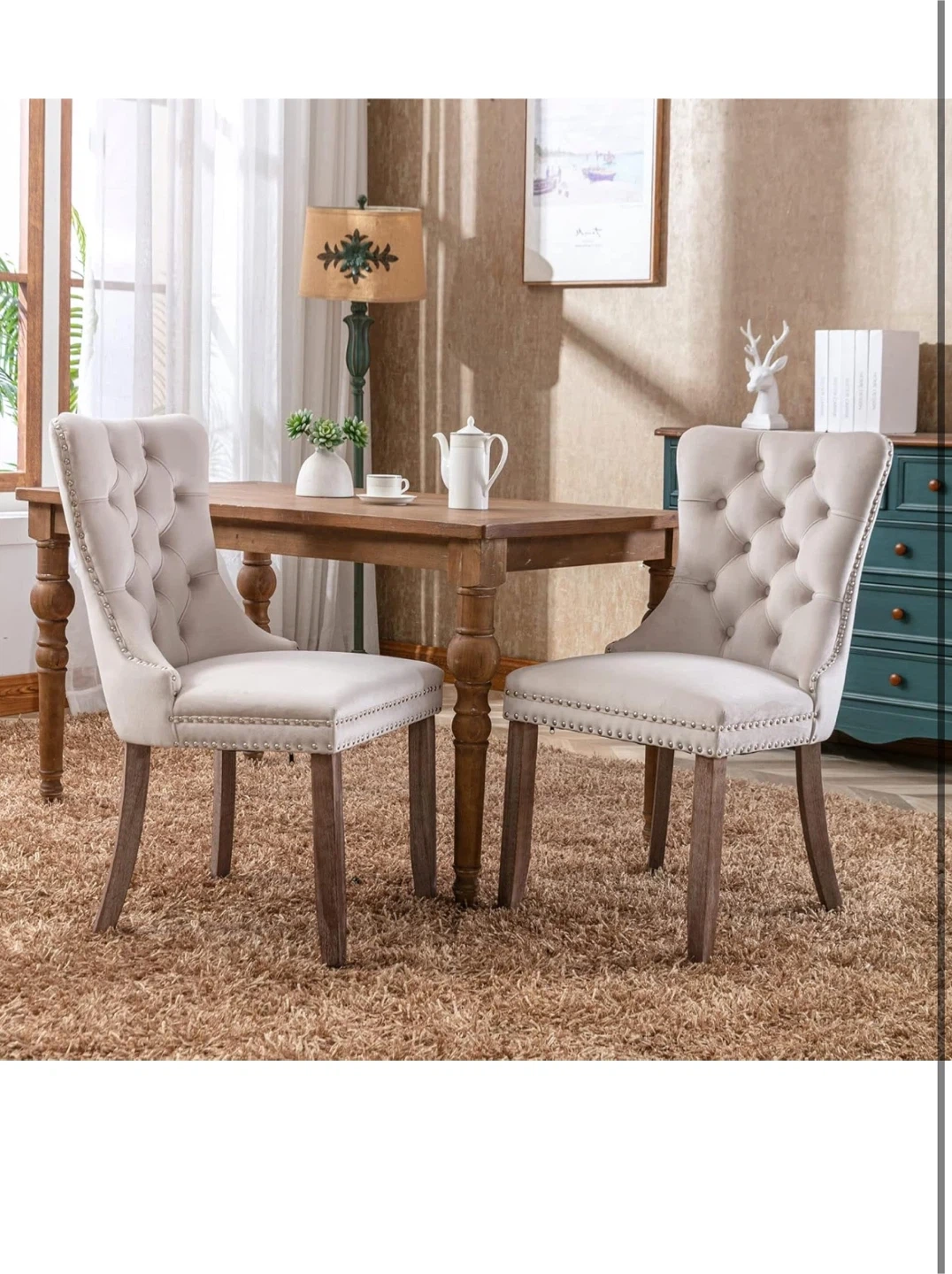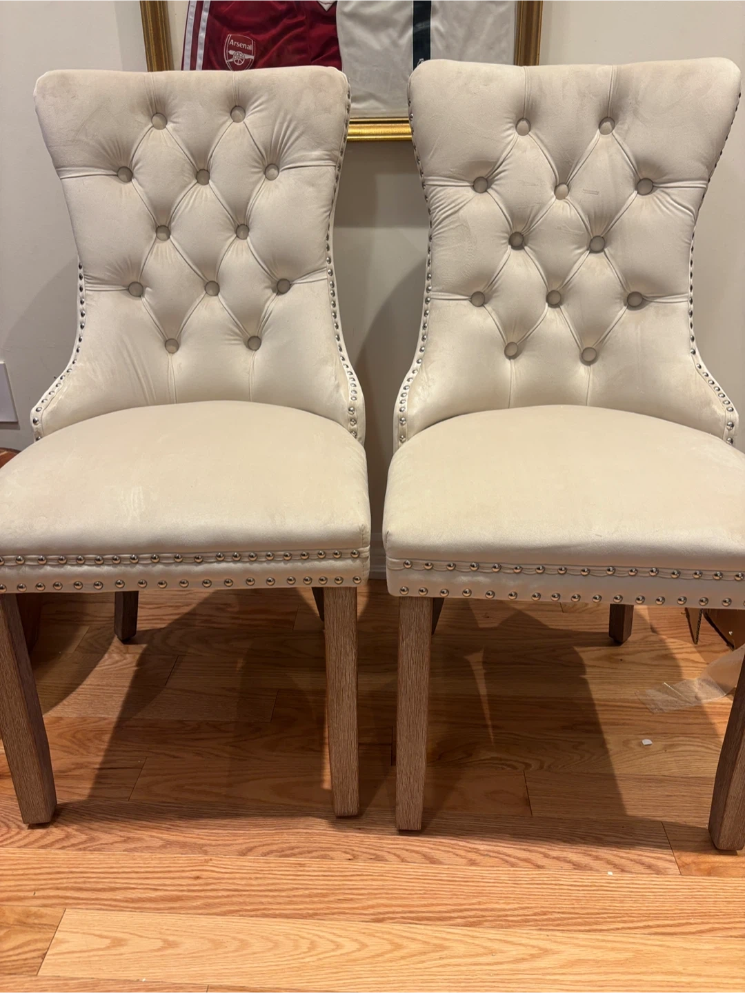 Stylish tufted dining chairs in a neutral beige velvet. These chairs feature a decorative ring pull on the back for a touch of elegance. Dimensions: 19.7" W x 24.4" D x 37.5" H. There is a tiny minor marks on the upholstery. Great chairs for your dining room!
