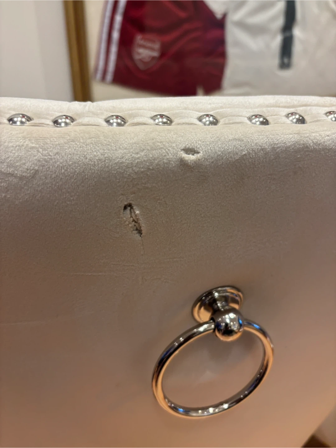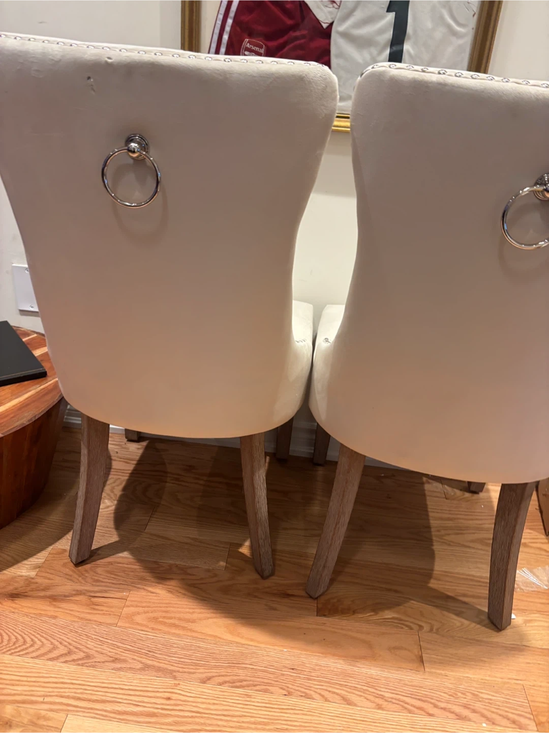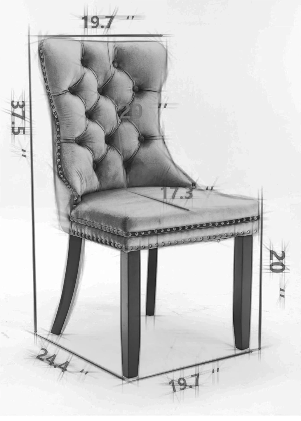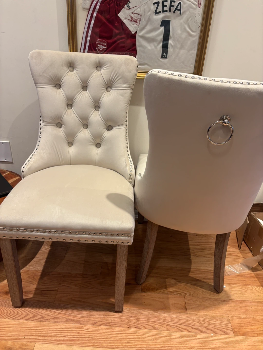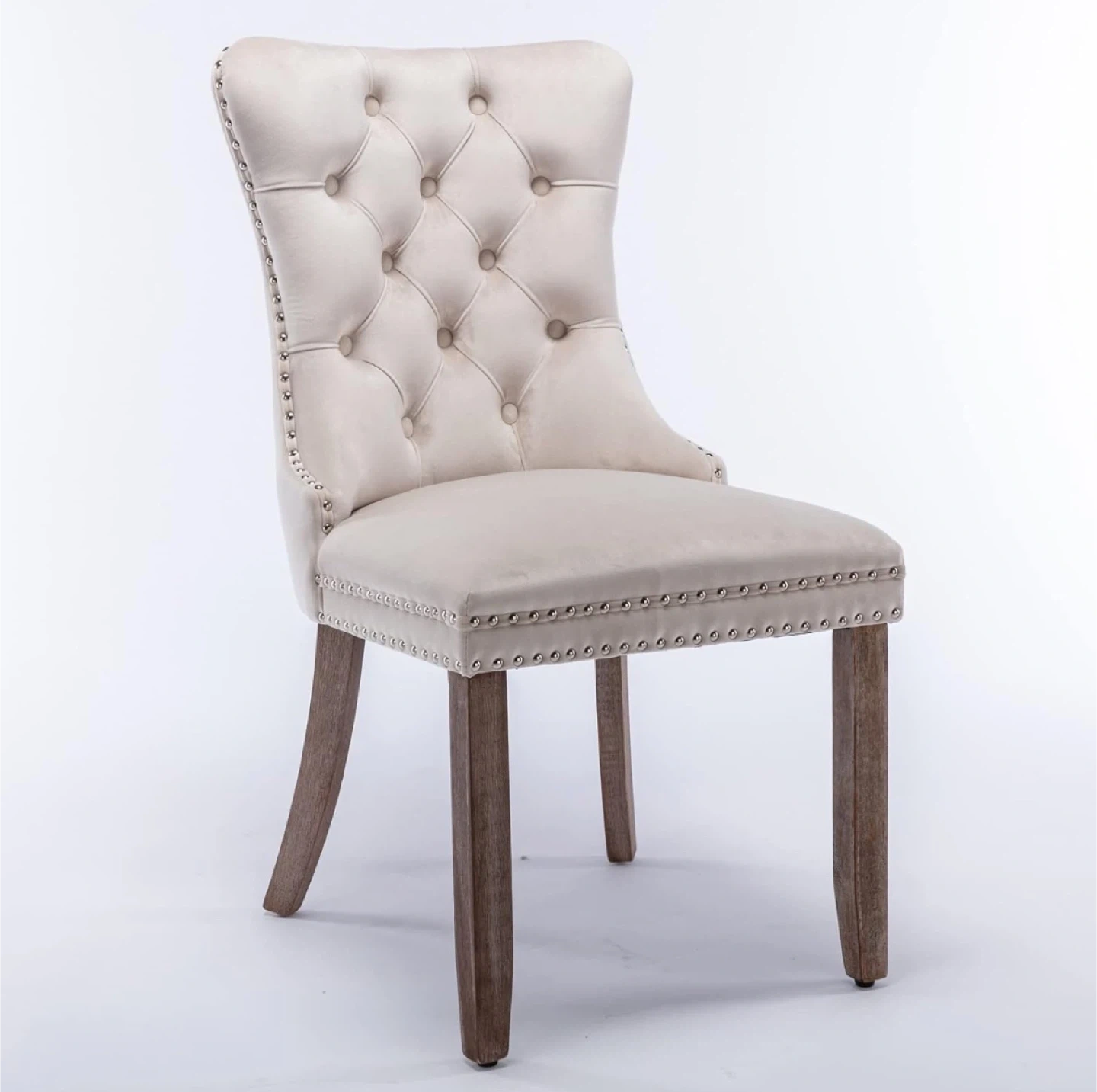 Stylish tufted dining chairs in a neutral beige velvet. These chairs feature a decorative ring pull on the back for a touch of elegance. Dimensions: 19.7" W x 24.4" D x 37.5" H. There is a tiny minor marks on the upholstery. Great chairs for your dining room!