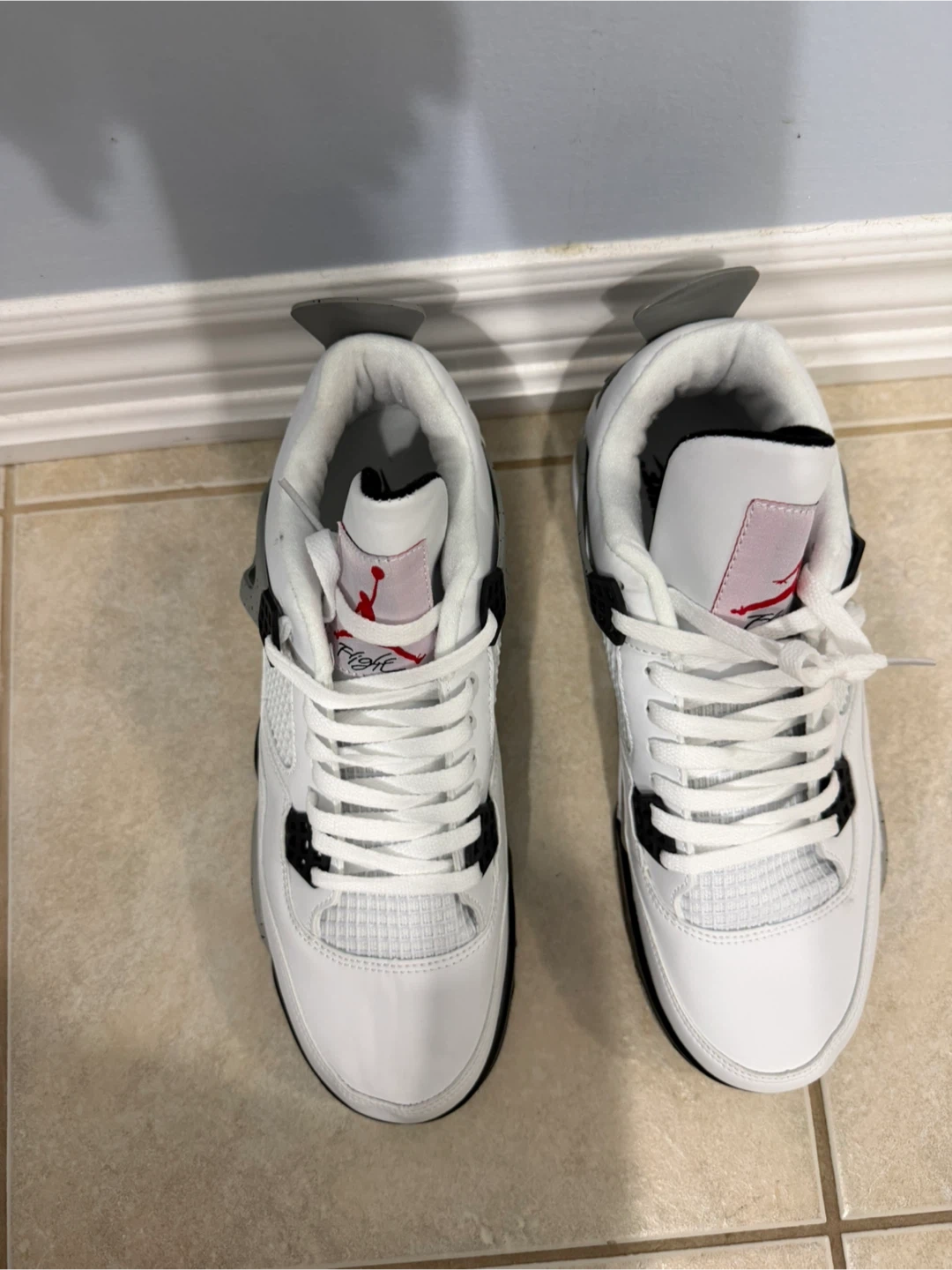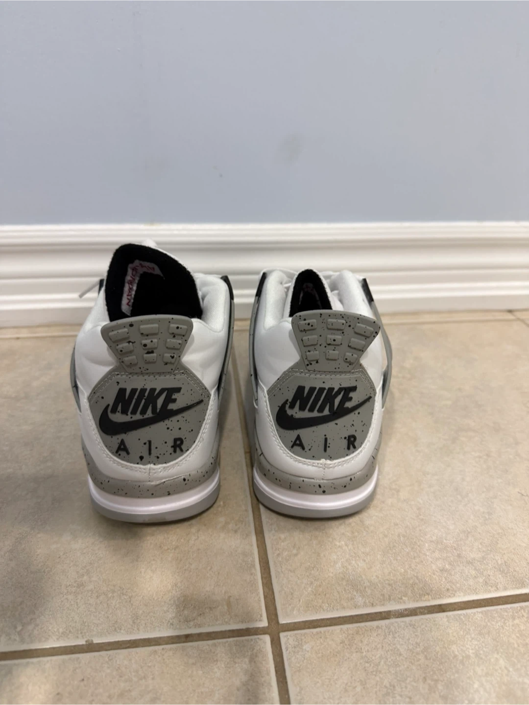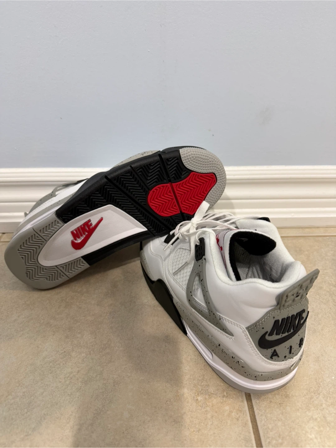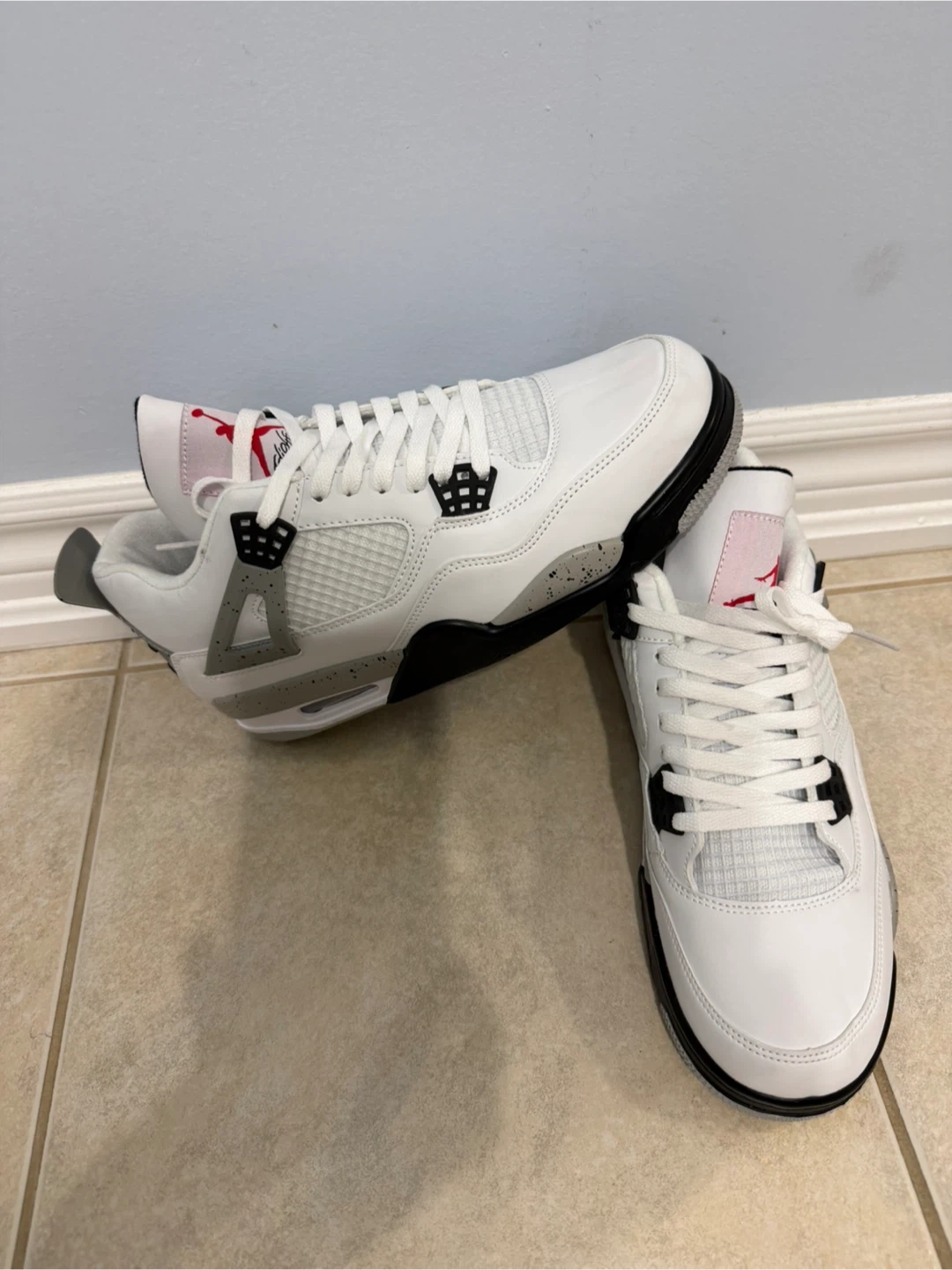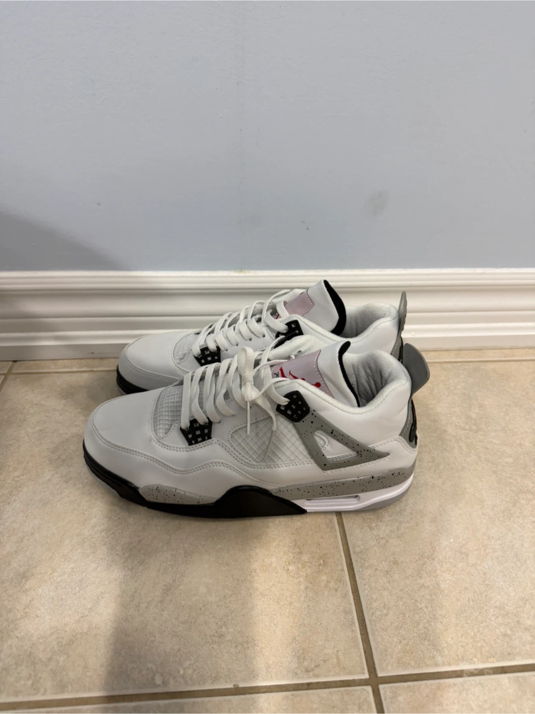 Classic Nike Air Jordan 4 sneakers in the iconic "Cement" colourway. These shoes feature a white leather upper with grey speckled accents and red Jumpman branding. "Nike Air" branding on the heel. Great for collectors and everyday wear!