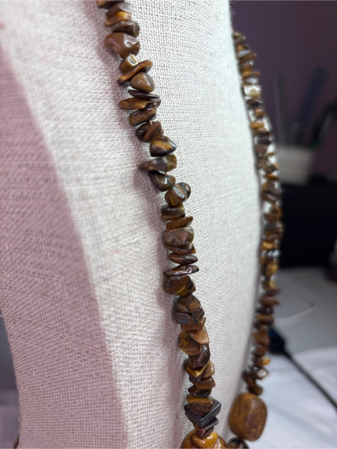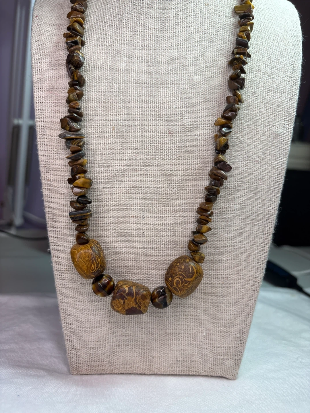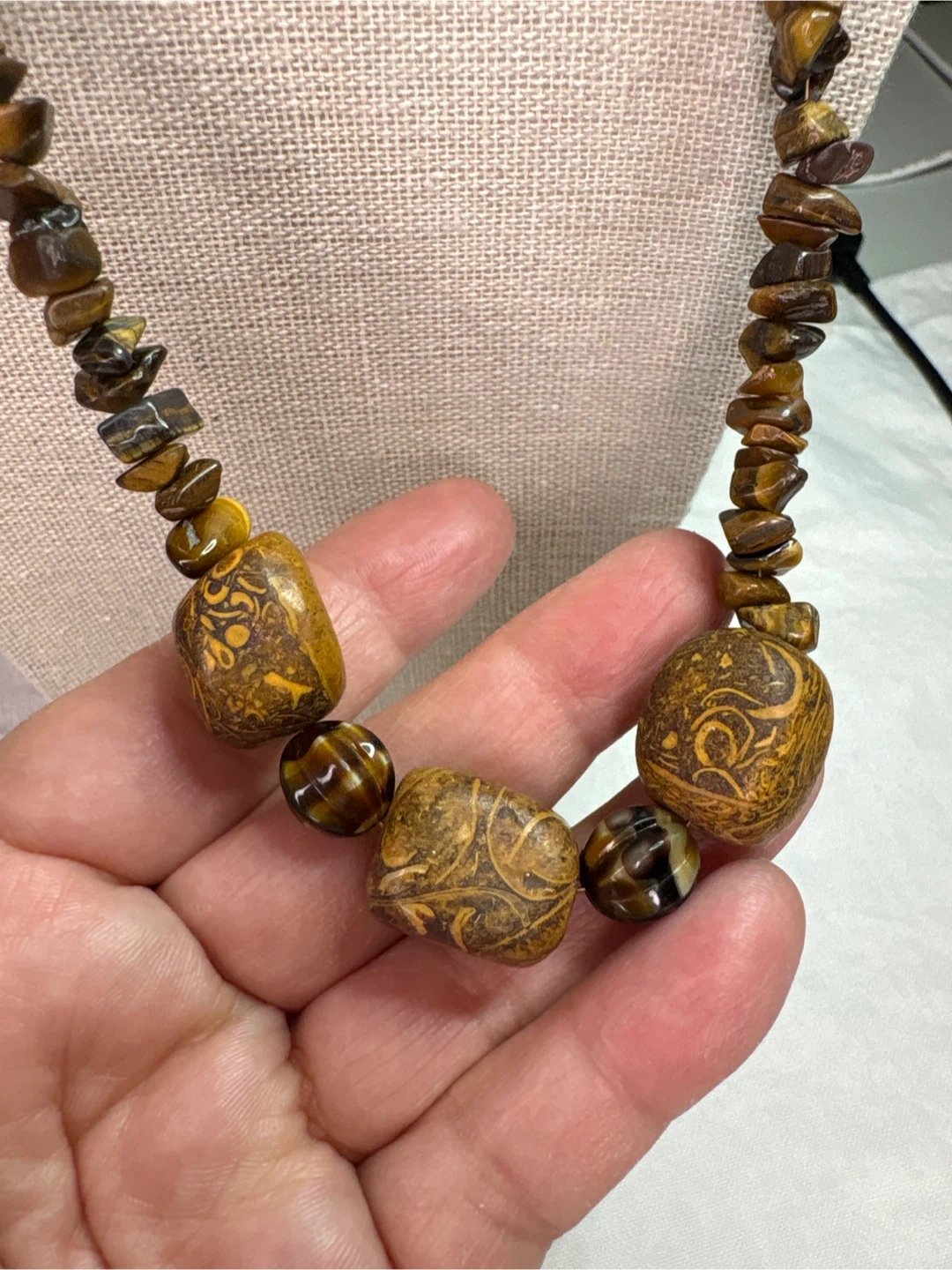 Tiger's Eye Beaded Necklace with Carved Wooden Beads