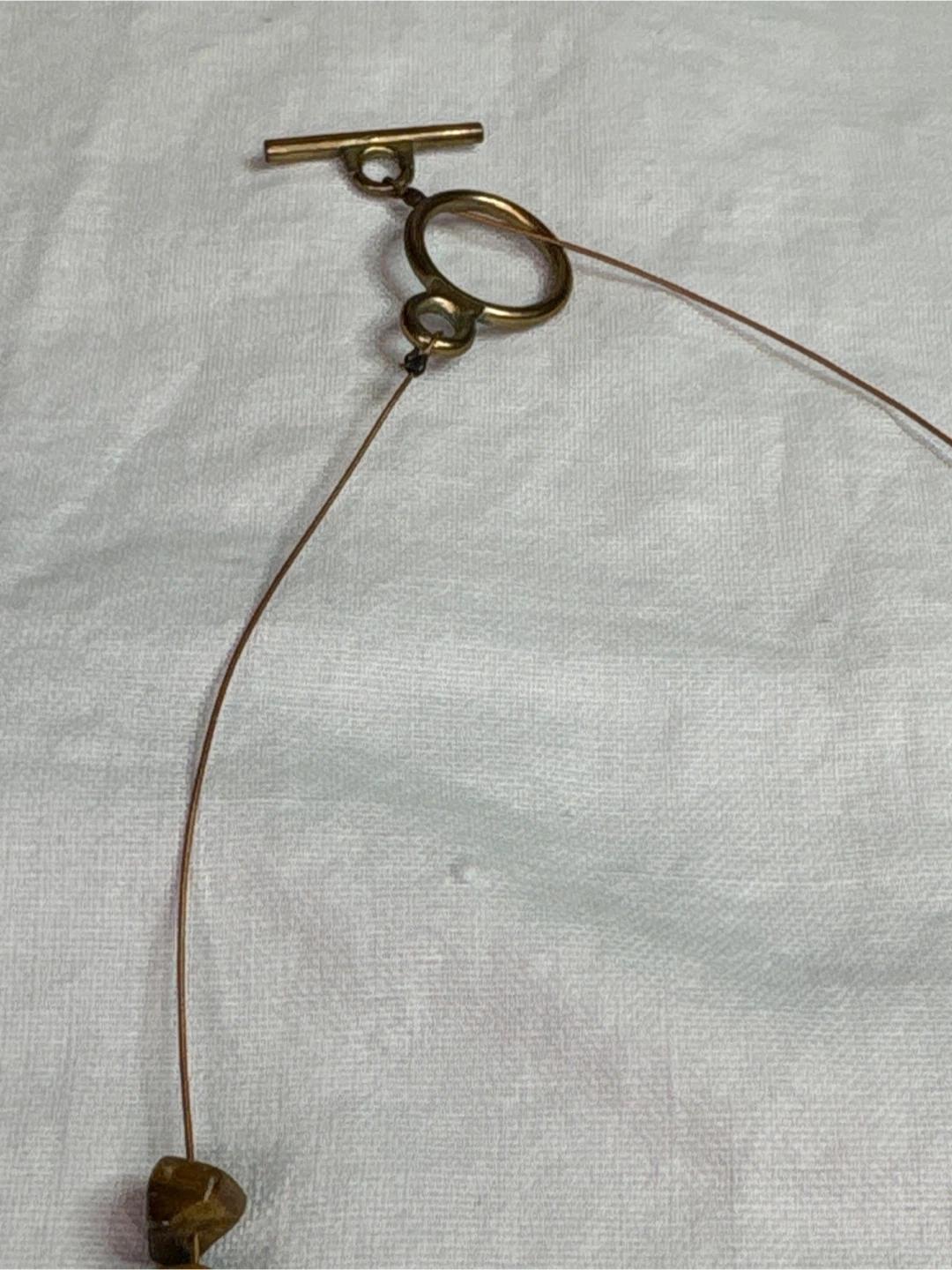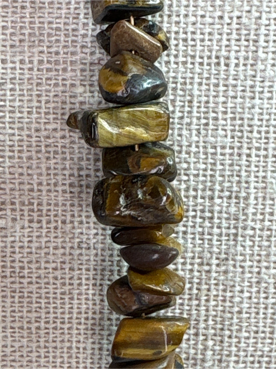 This unique necklace features a mix of natural tiger's eye chip beads and carved calligraphy stone( Miriam stone). Miriam stone is found in the Himalayas, India. Made of hematite, mud, and plants. On a copper wire with a toggle clasp for easy wear. A lovely statement piece for any jewellery collection!