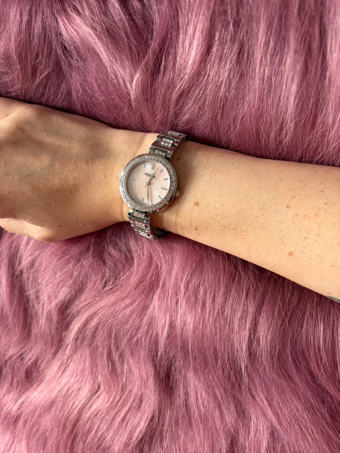 Lovely Fossil ladies' watch featuring a pink mother of pearl dial and a sparkling crystal-embellished bezel. The silver-tone metal band is also accented with crystals. It comes in its original Fossil box, ready for gifting or personal wear!
