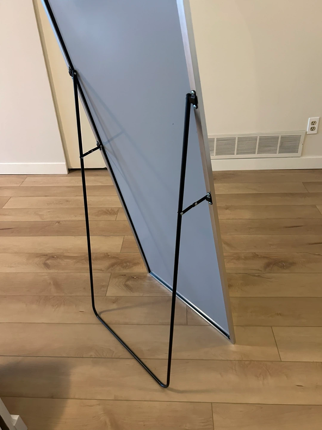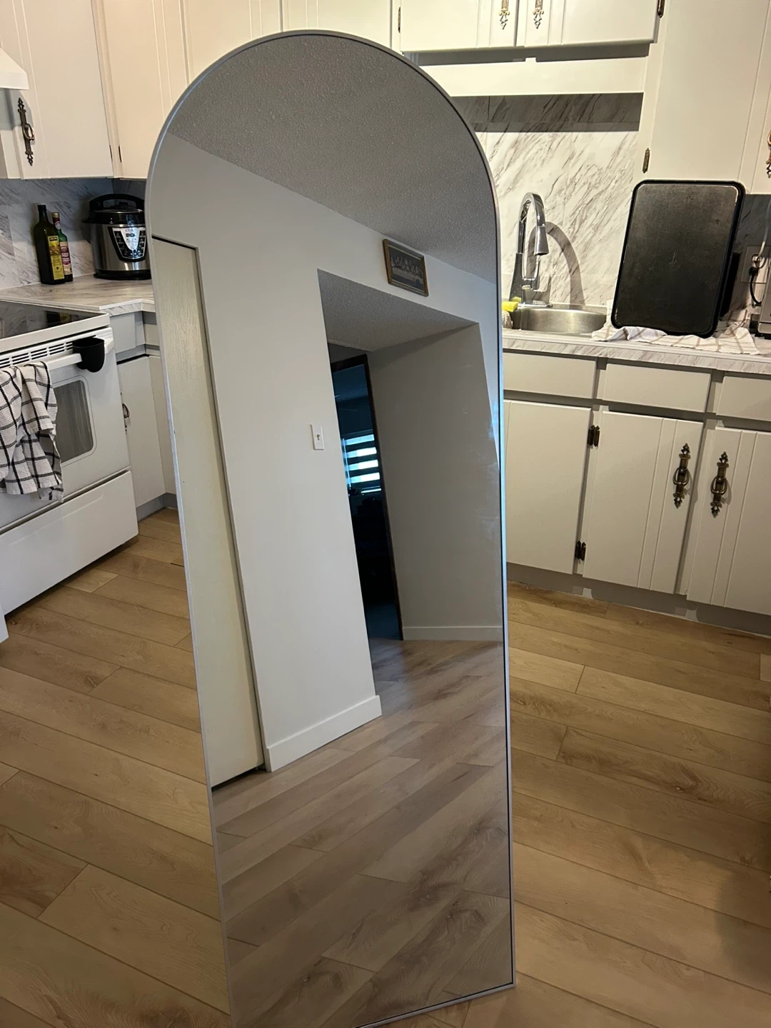 Selling a super cute stylish arched full-length mirror with a silver-toned frame. It comes with a black metal stand for easy placement in any room. Bought for our wedding but have no need for it anymore!