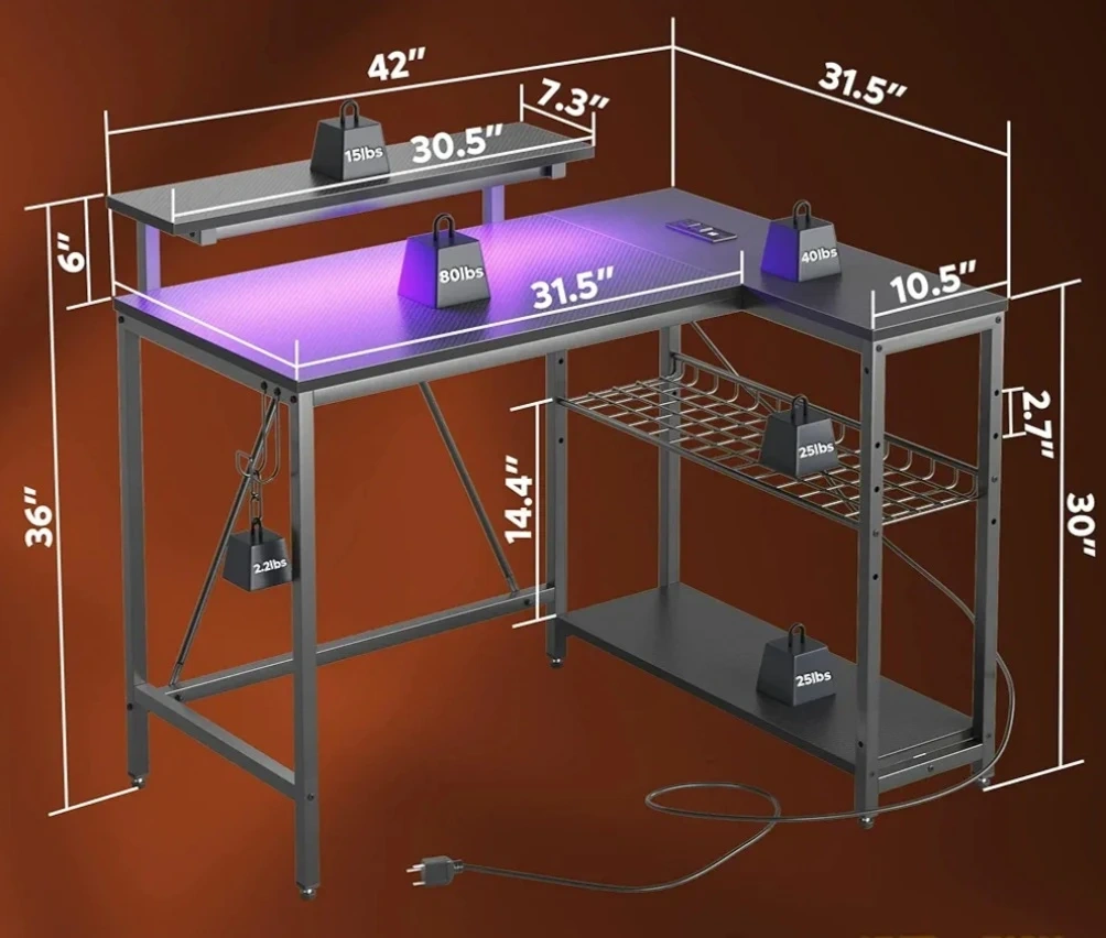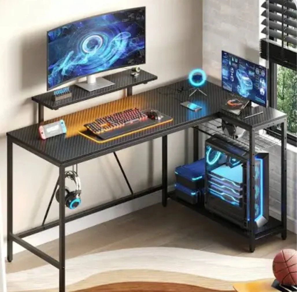 Spacious L-shaped gaming desk. Features a sturdy metal frame and a textured, easy-to-clean surface. Plenty of space for multiple monitors, a PC tower, and accessories.