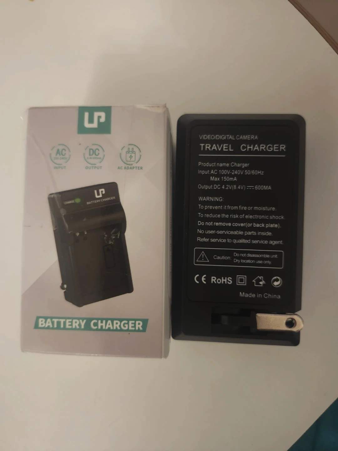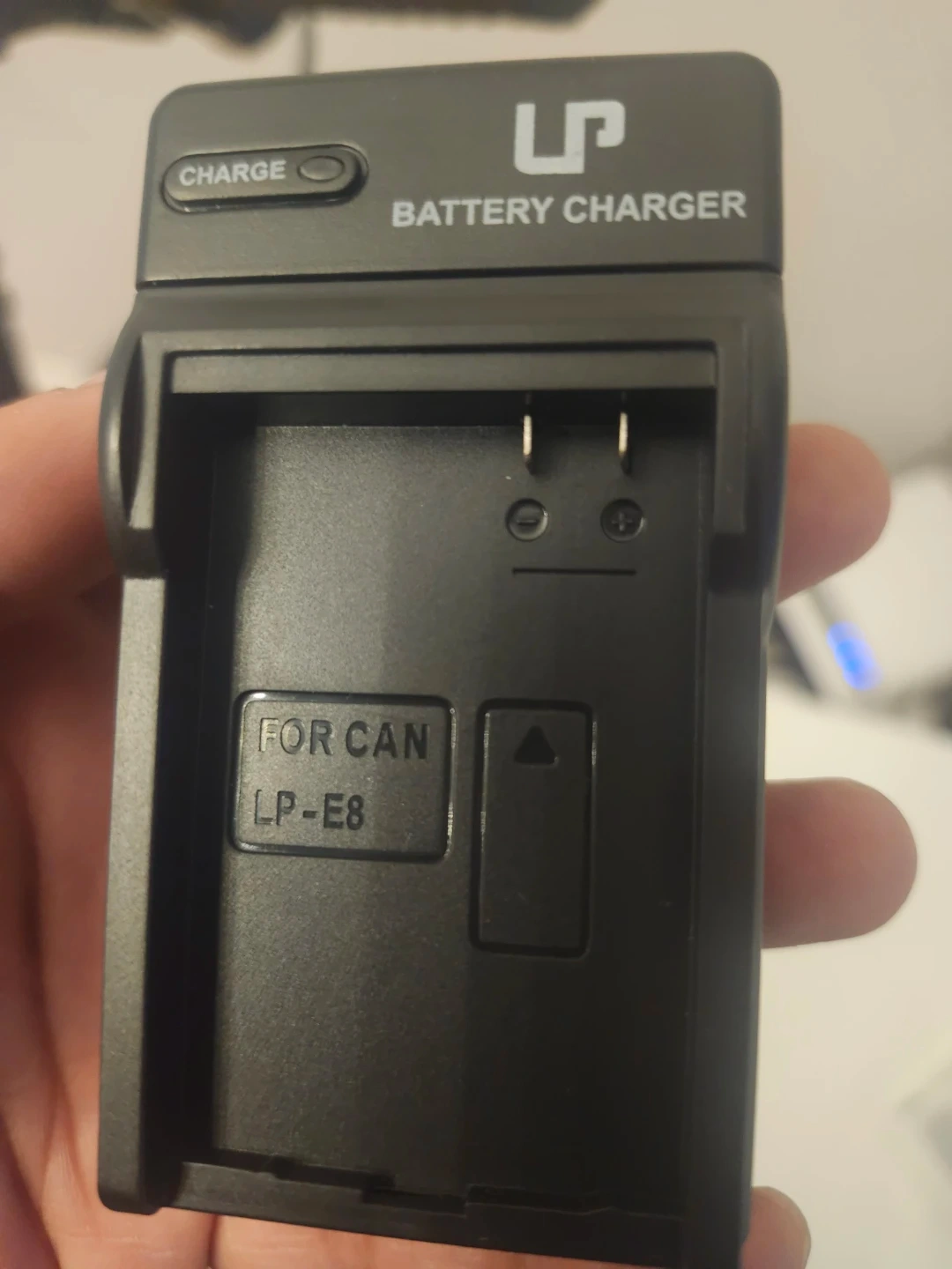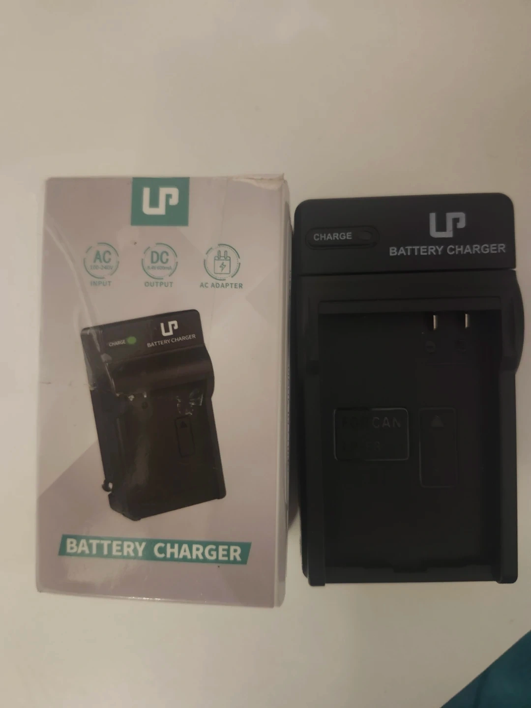 This is an LP LP-E8 battery charger designed for Canon cameras. It supports AC input from 100-240V and outputs DC 4.2V at 600mA. The charger has an indicator light that turns red when charging and green when the battery is fully charged.