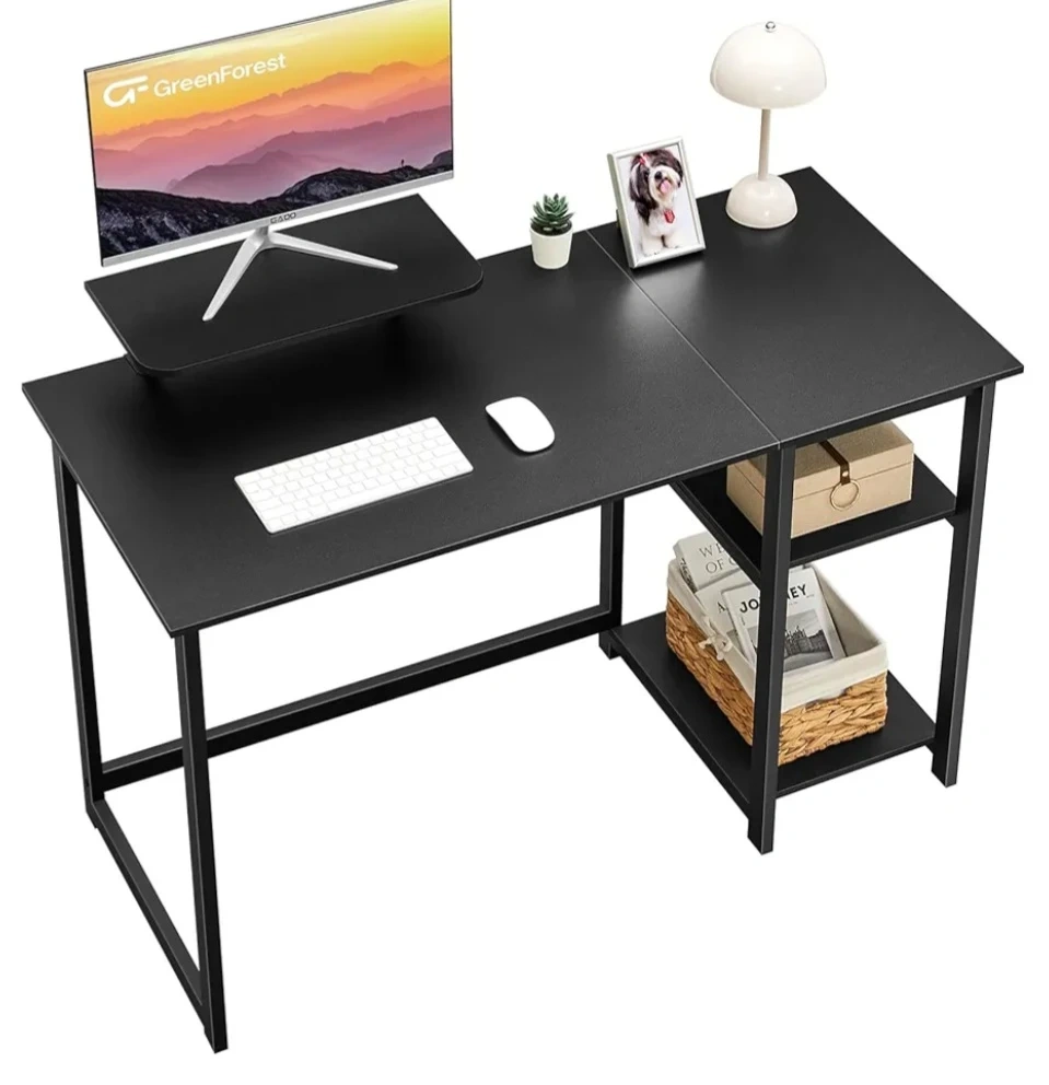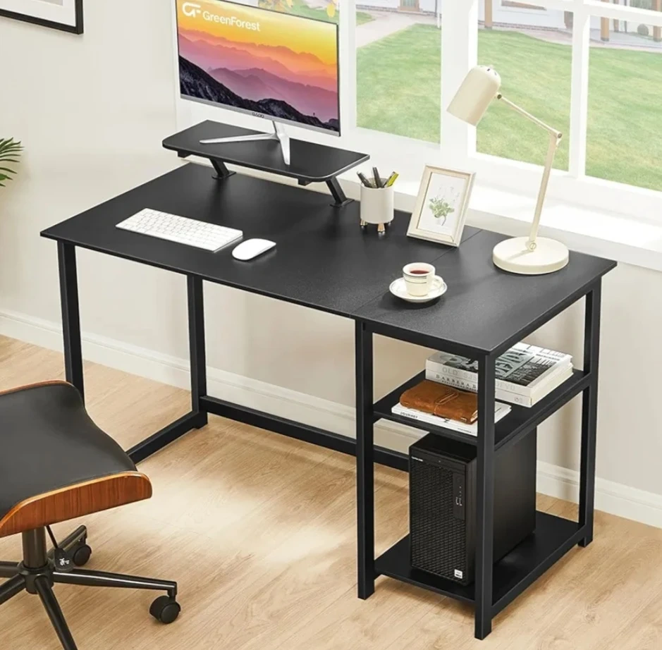 This modern computer desk offers a spacious work surface and built-in storage shelves, perfect for any home office. Its sleek black design complements any decor. Desk dimensions are 47.24" W x 19.68" D x 29.52" H. A great addition for a tidy workspace!