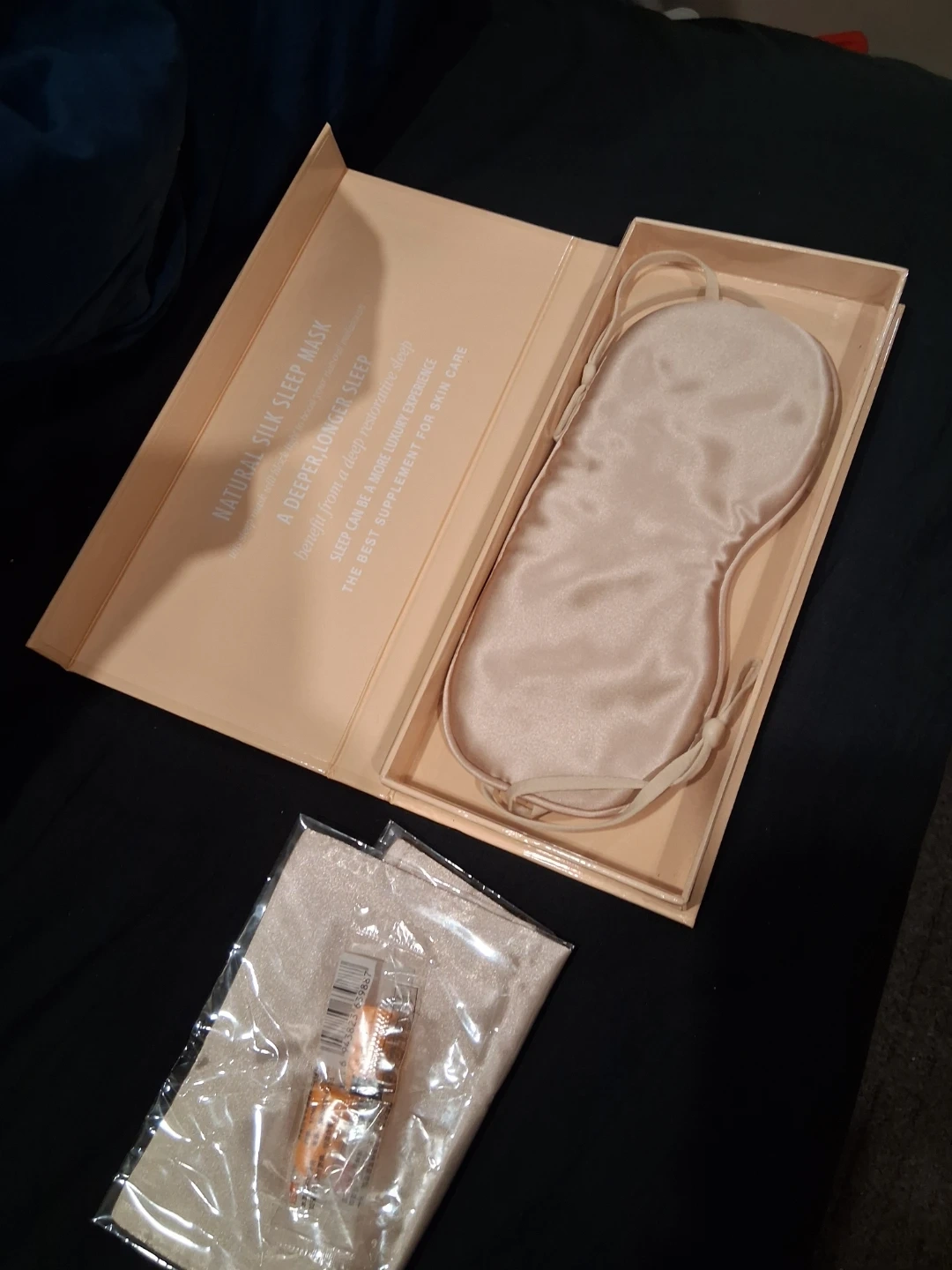 This is the ARIN Mulberry Silk Sleep Mask. It's made from 100% mulberry silk for a deep, restorative sleep. Comes in its original box with all components. A great addition to your skincare routine!