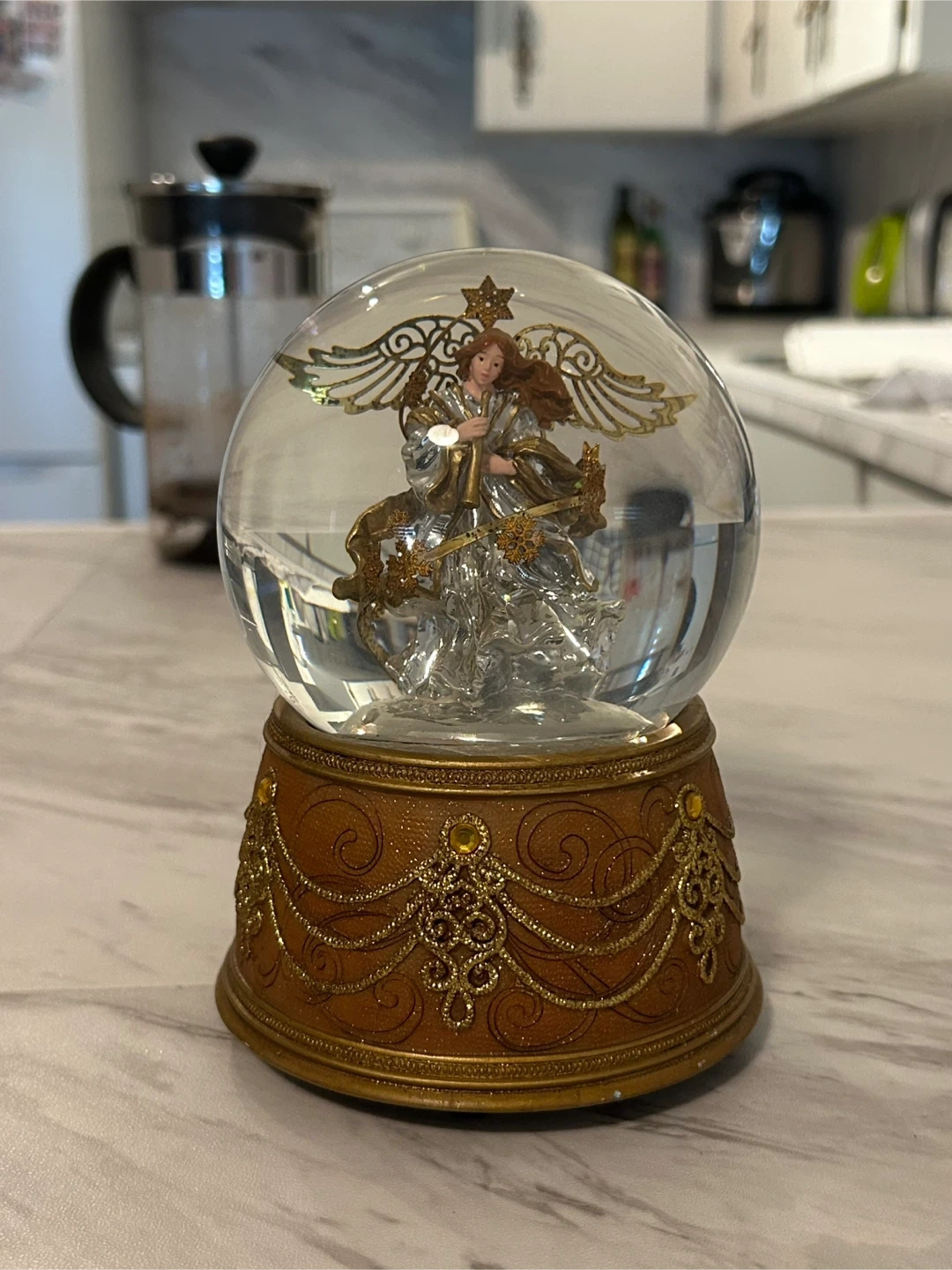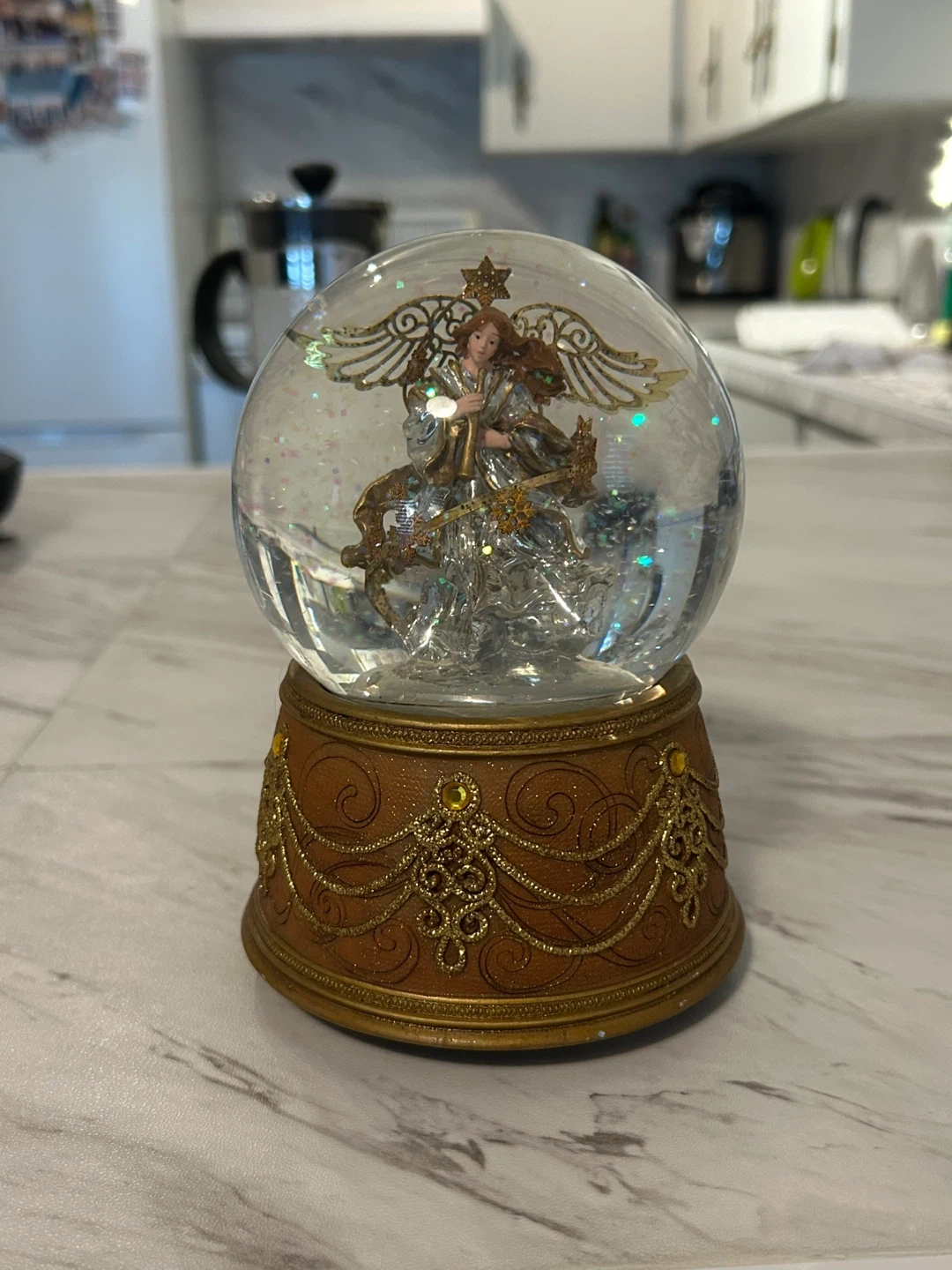 Beautiful angel musical snow globe with glittery water. Features an ornate gold-toned base with intricate scrolling details. Wind-up mechanism on the bottom plays a pretty instrumental song. Love it but recently moved so need to clear out. Originally $40 before tax. Still has the tag so could be a gift