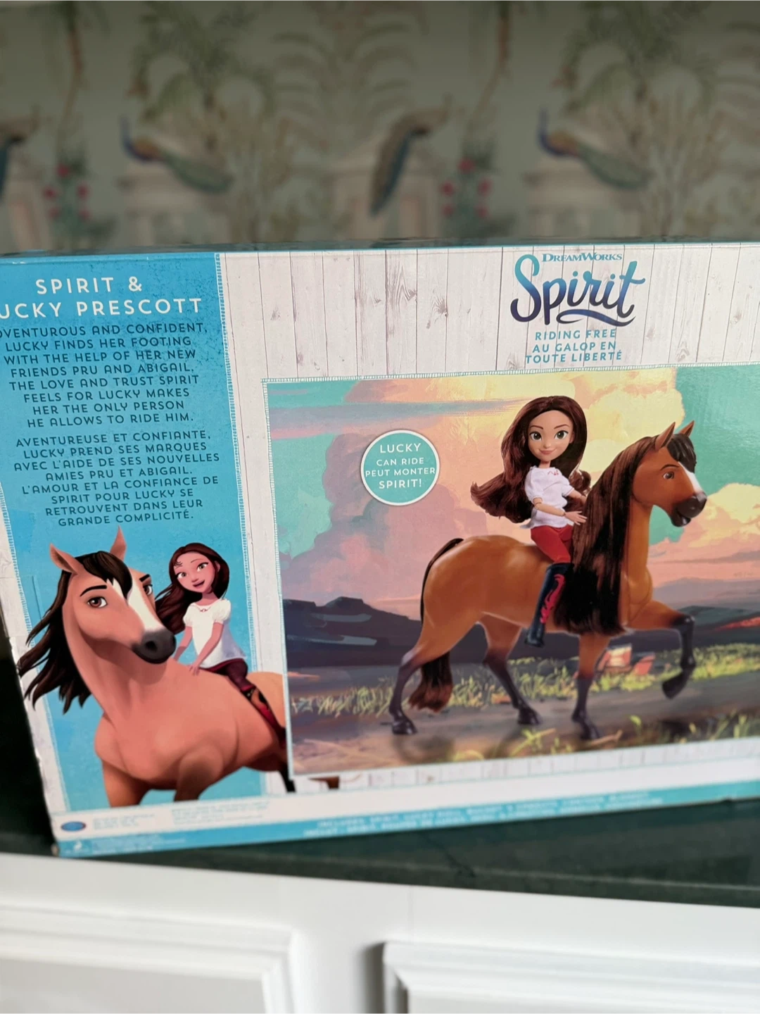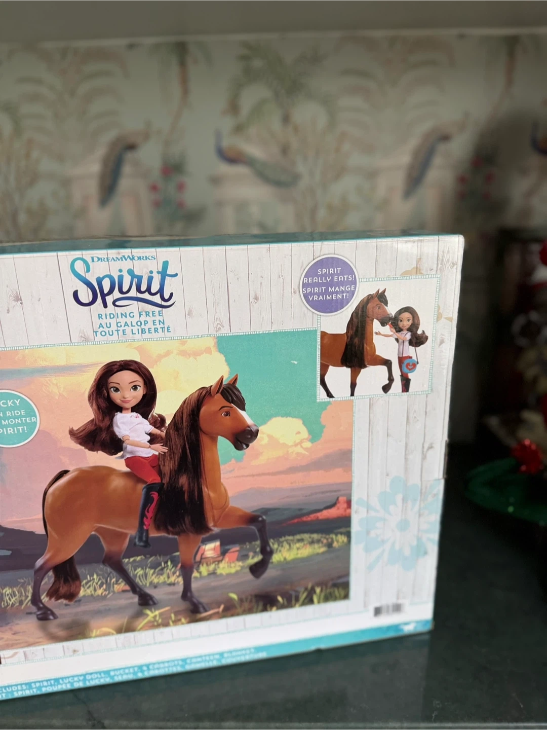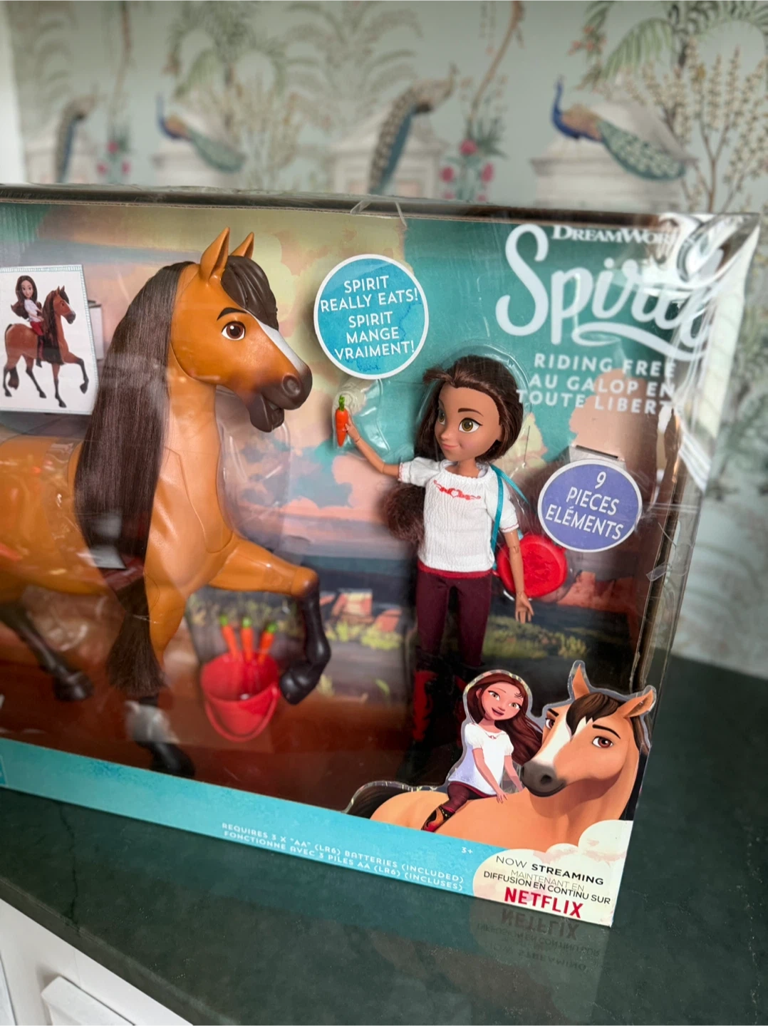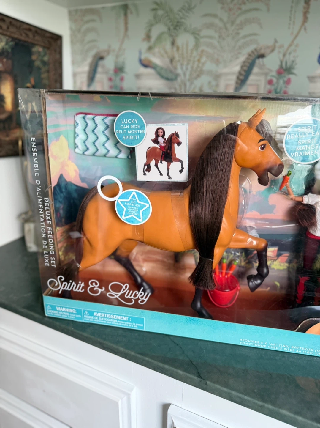 This Spirit & Lucky Deluxe Feeding Set features a doll and a horse. It includes 9 pieces for interactive play, and the horse 'really eats'! Requires 2 'AA' batteries, not included. Fun for any Spirit Riding Free fan!
