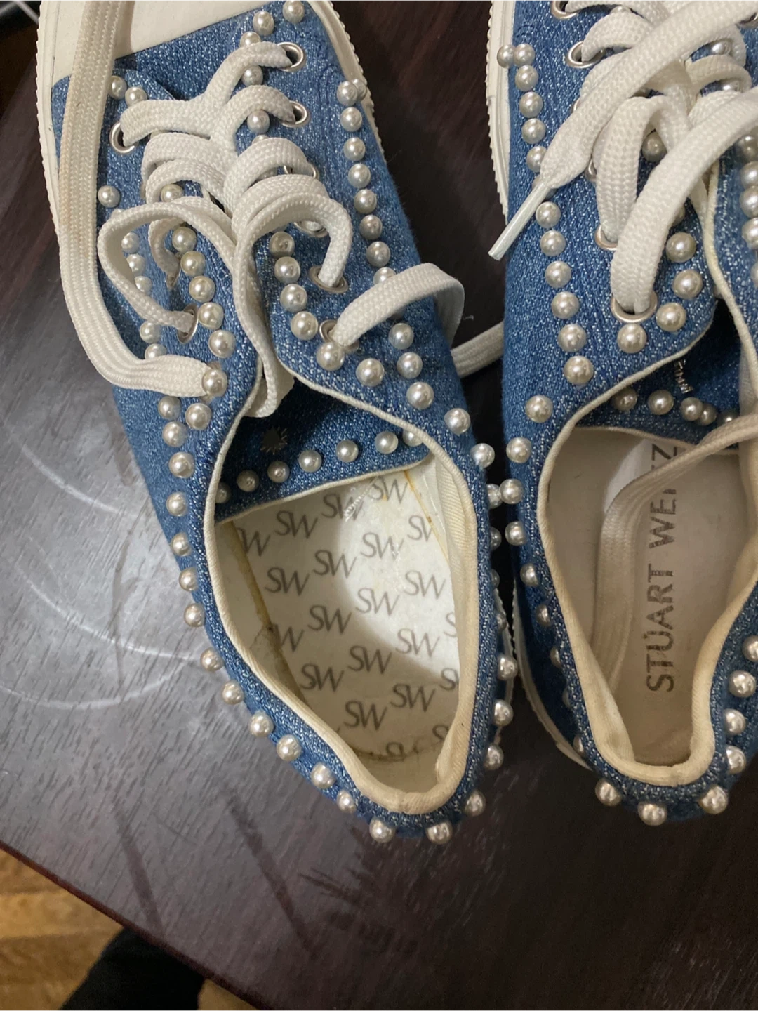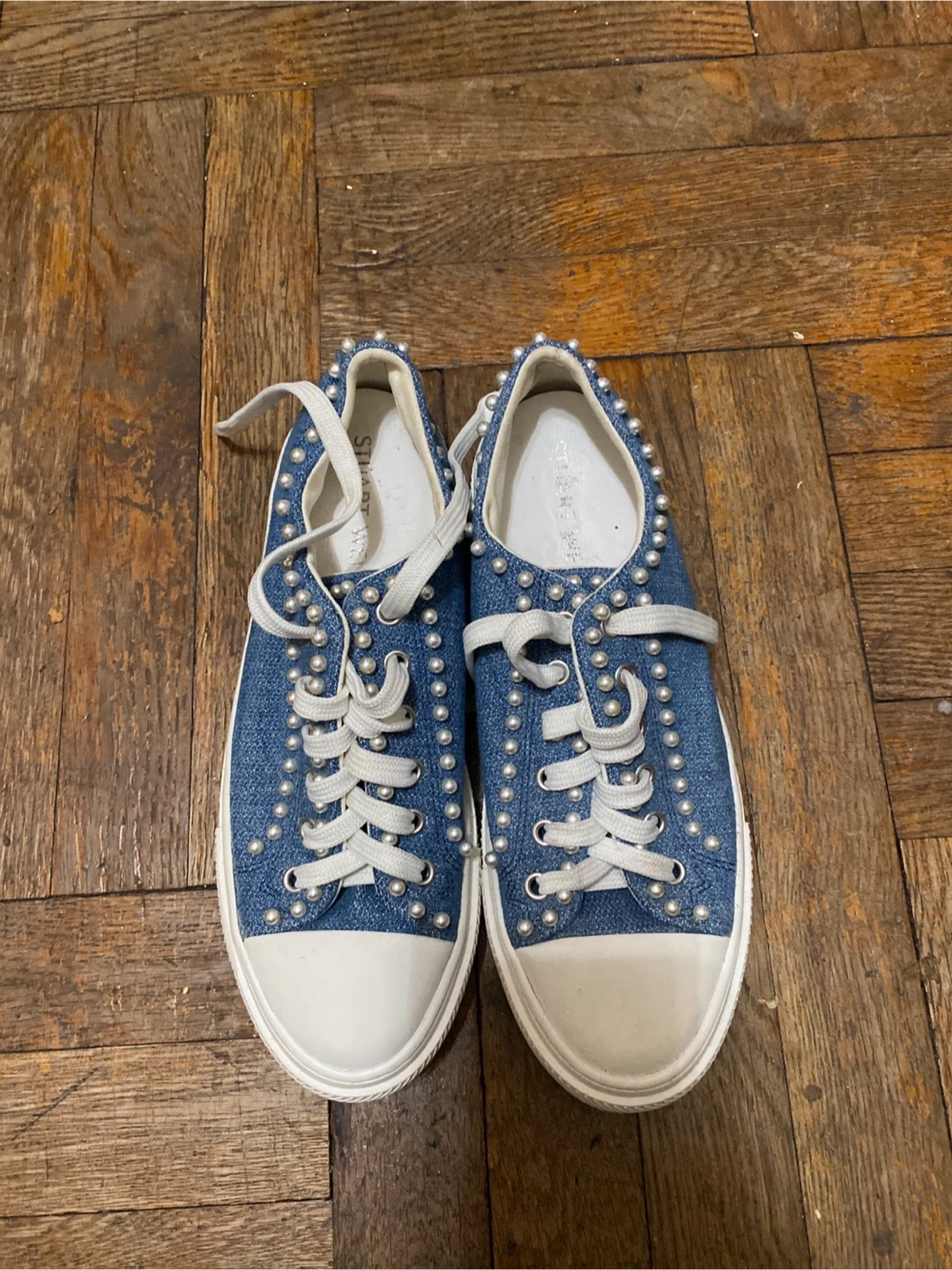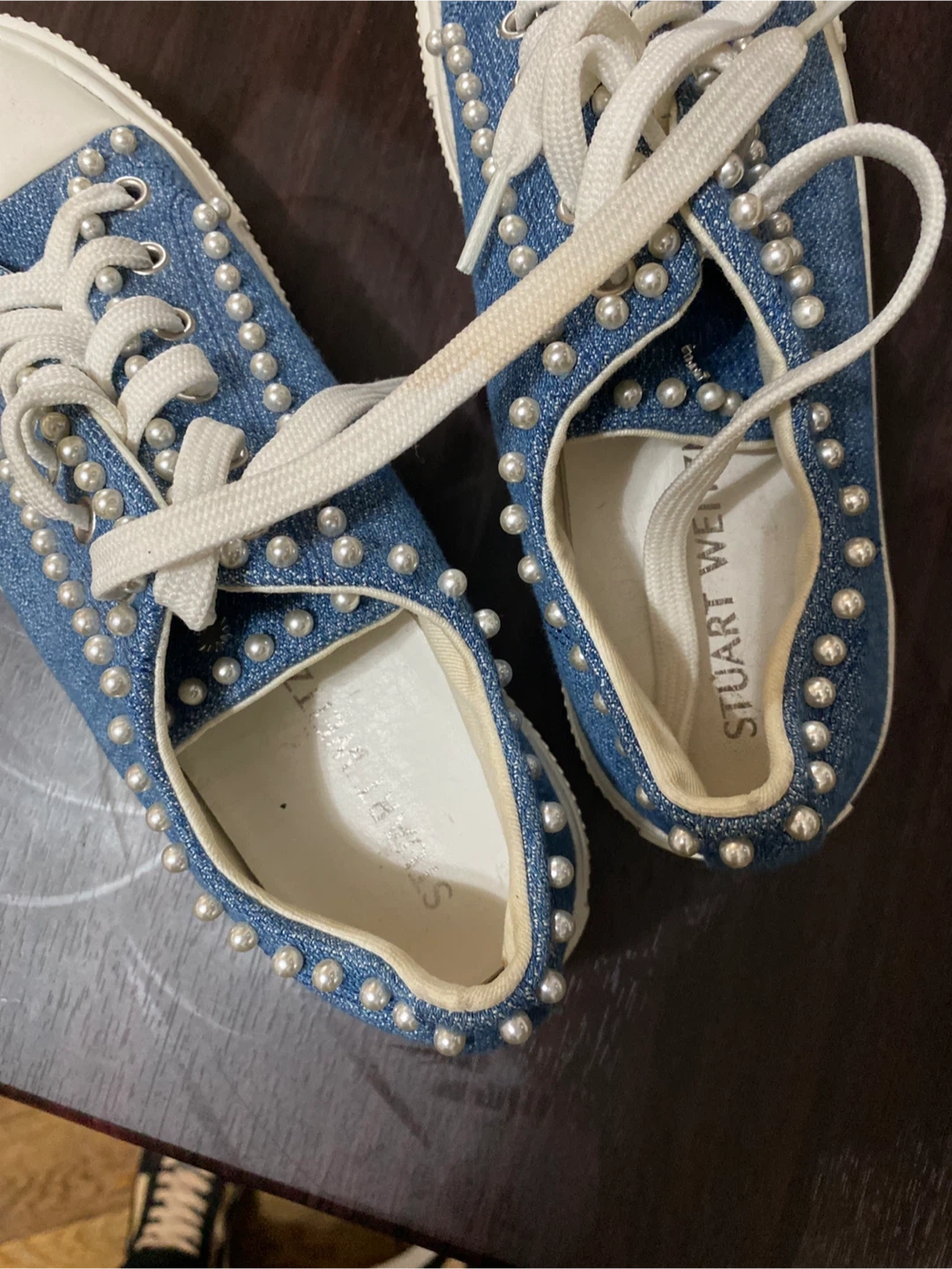 Stylish Stuart Weitzman denim sneakers embellished with pearls. Classic lace-up style with a white toe cap and sole. These shoes add a unique touch to any outfit!
