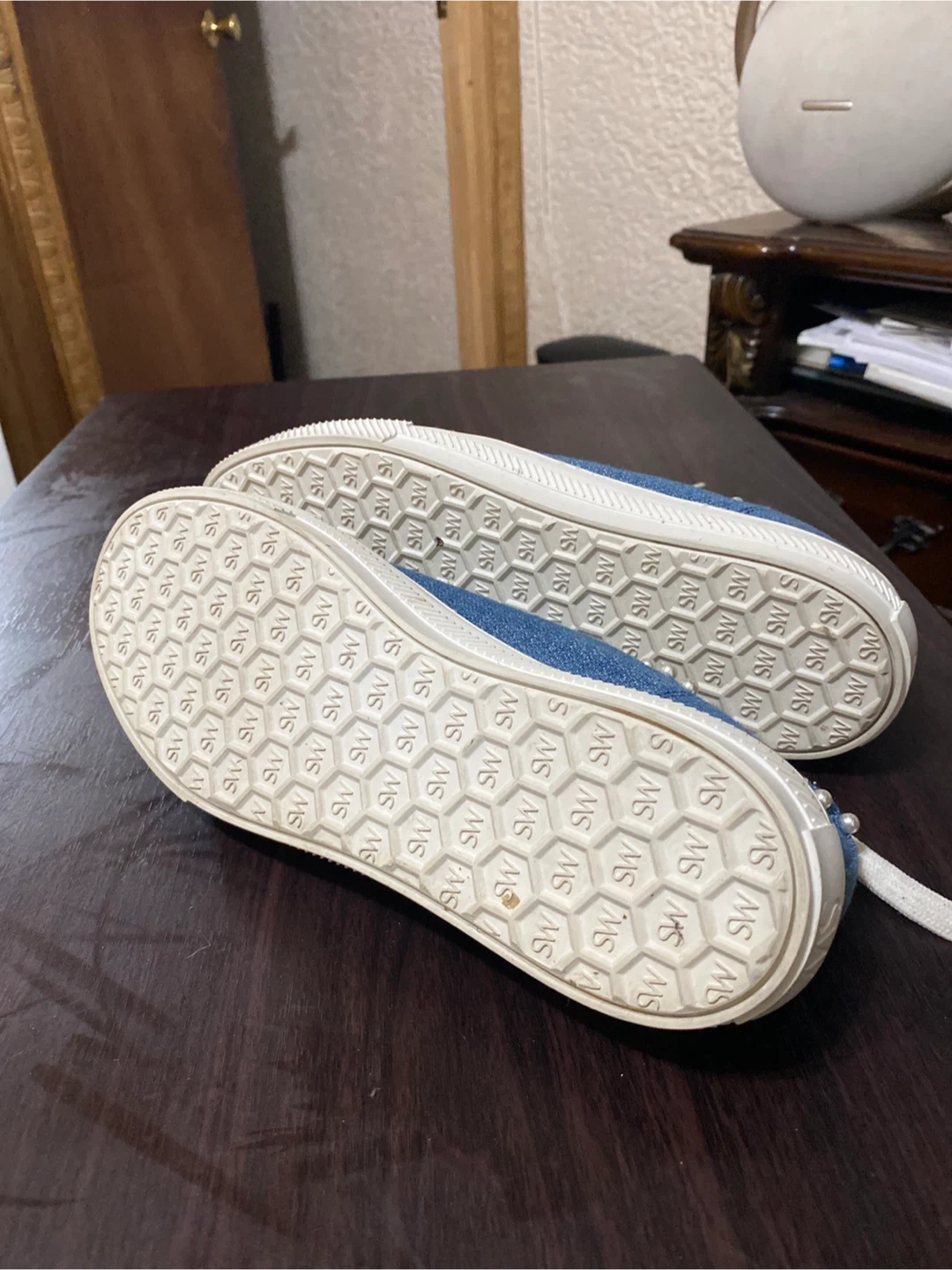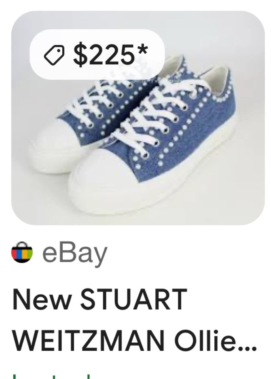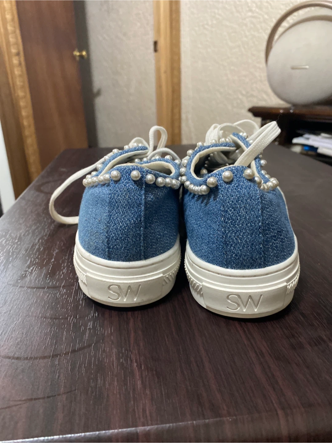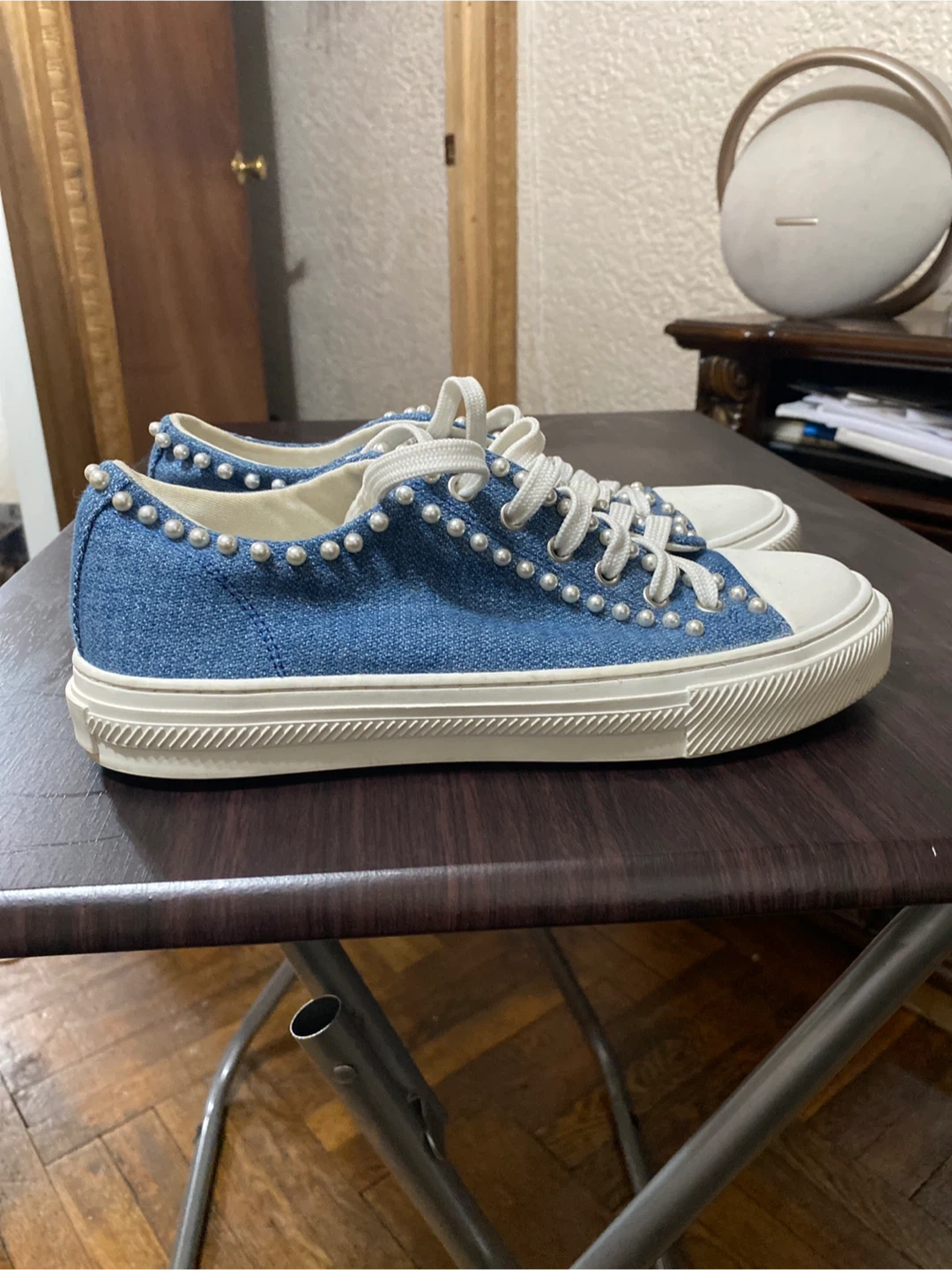 Stylish Stuart Weitzman denim sneakers embellished with pearls. Classic lace-up style with a white toe cap and sole. These shoes add a unique touch to any outfit!