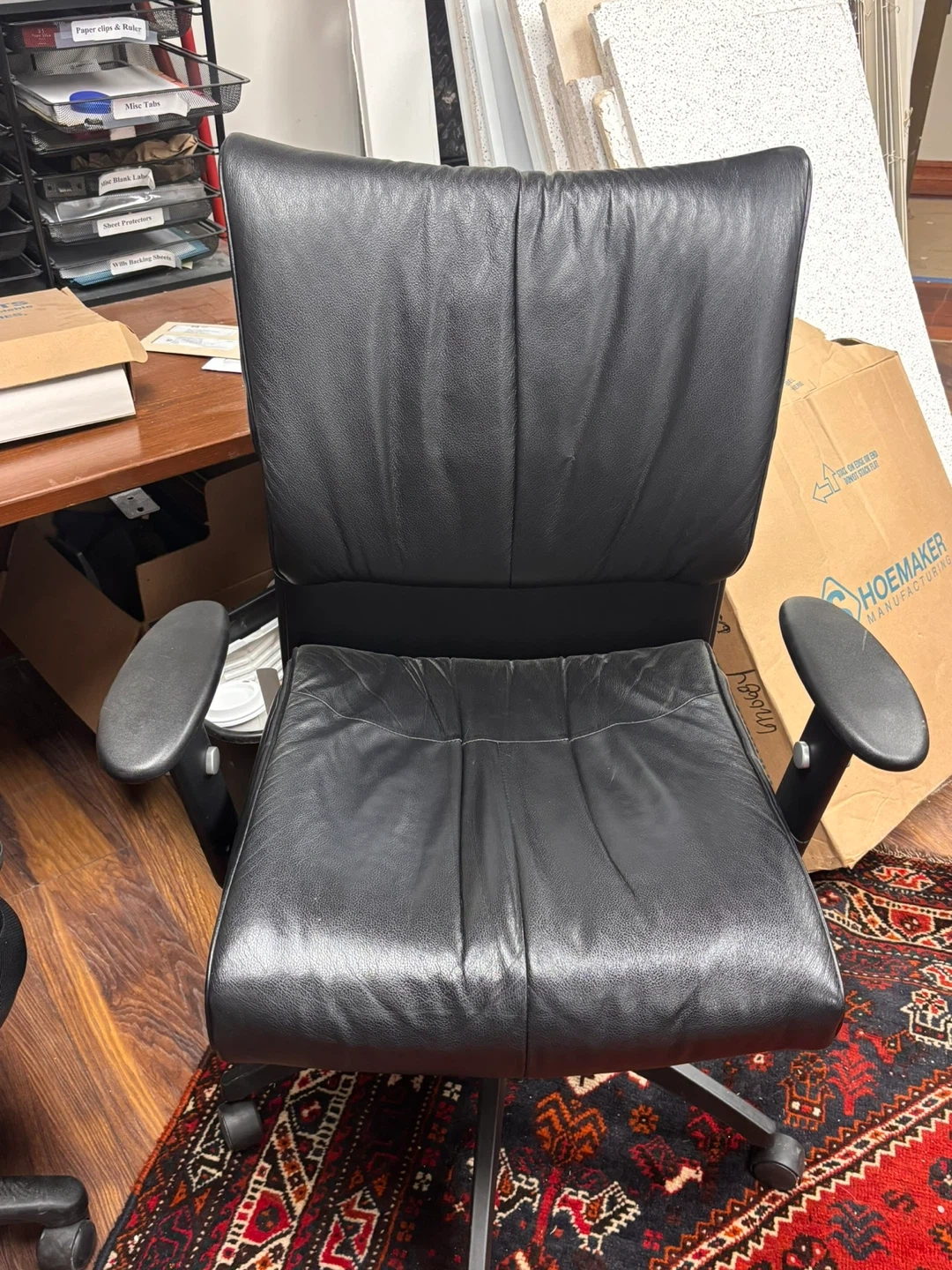 This is a black leather office chair with adjustable armrests. It offers comfortable seating for long workdays. The chair is made of durable leather.
