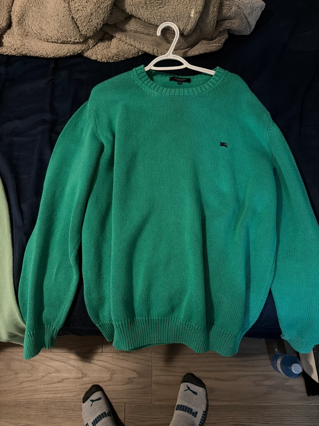 This is a green crew neck sweater from Burberry. It features a small embroidered logo on the chest. The material is knit. This sweater would be good for a man or woman.