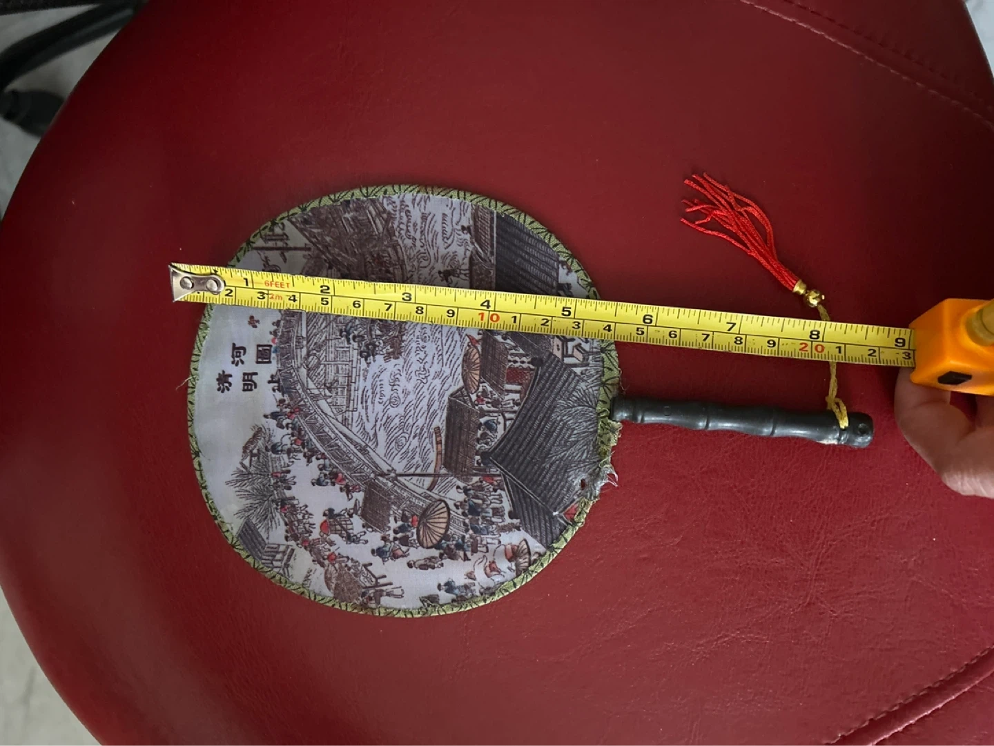 This round decorative fan features a scenic print with a red tassel attached. It's approximately 10 inches in diameter. This fan adds a unique touch of style. Very useful in a warm day.