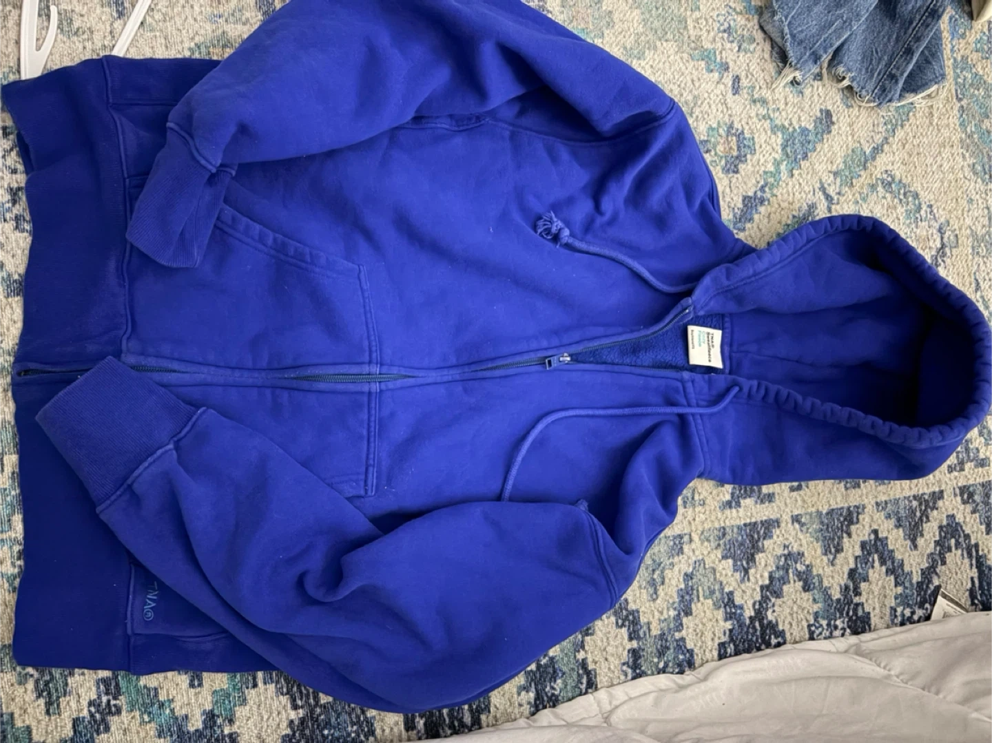 A blue zip-up hoodie from TNA. It's a comfortable and casual layering piece. Made from a soft fabric blend.