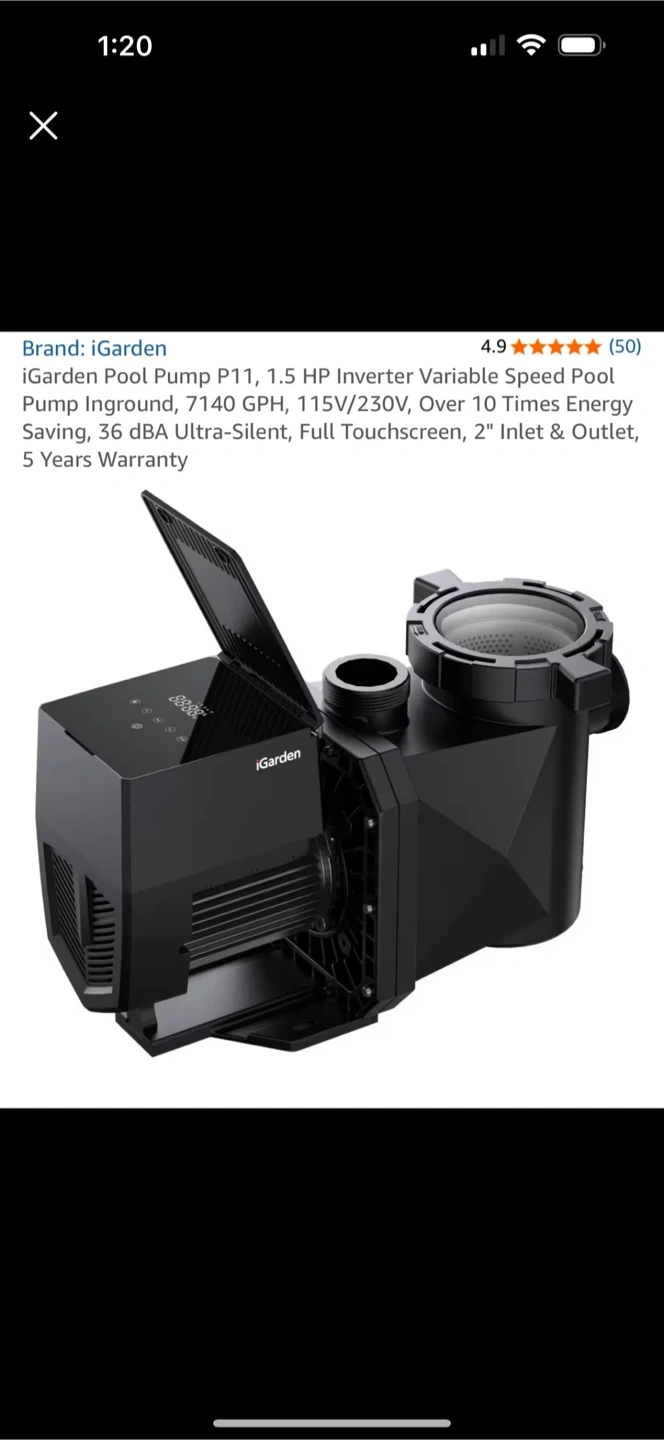 Selling an iGarden Pool Pump P11, a 1.5 HP Inverter Variable Speed Pool Pump. It's designed for inground pools and boasts a 7140 GPH flow rate. Operates on 115V/230V, offering over 10 times energy saving, and runs ultra-silent at 36 dBA. Features a full touchscreen, and 2" inlet & outlet