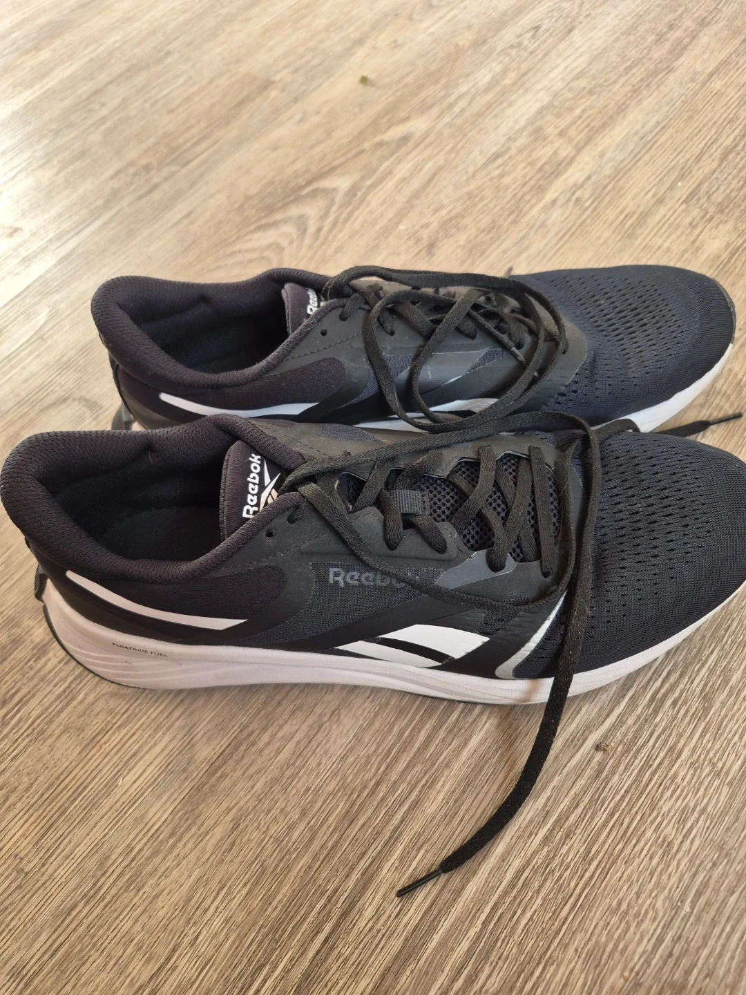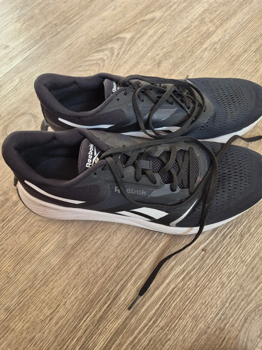 These black Reebok running shoes feature a mesh upper for breathability. They're lightweight and designed for athletic activities. Ideal for runners or gym-goers!