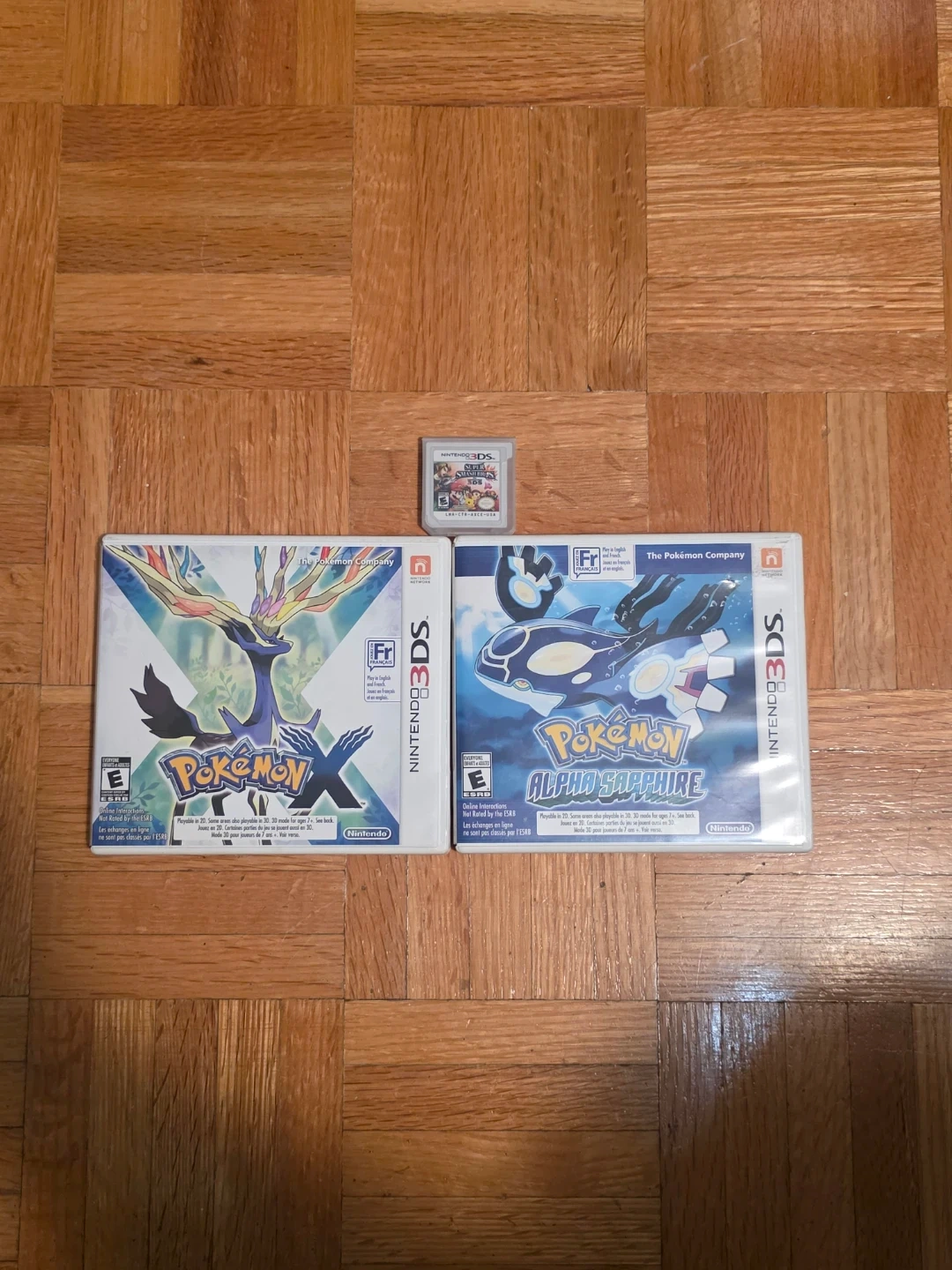 Bundle of three Nintendo 3DS games: Pokemon X, Pokemon Alpha Sapphire, and Super Smash Bros. for Nintendo 3DS. These games are for the Nintendo 3DS system.