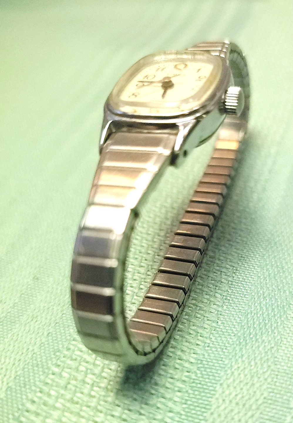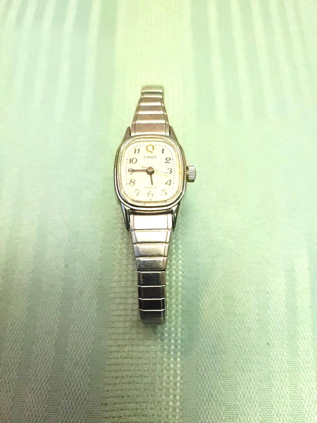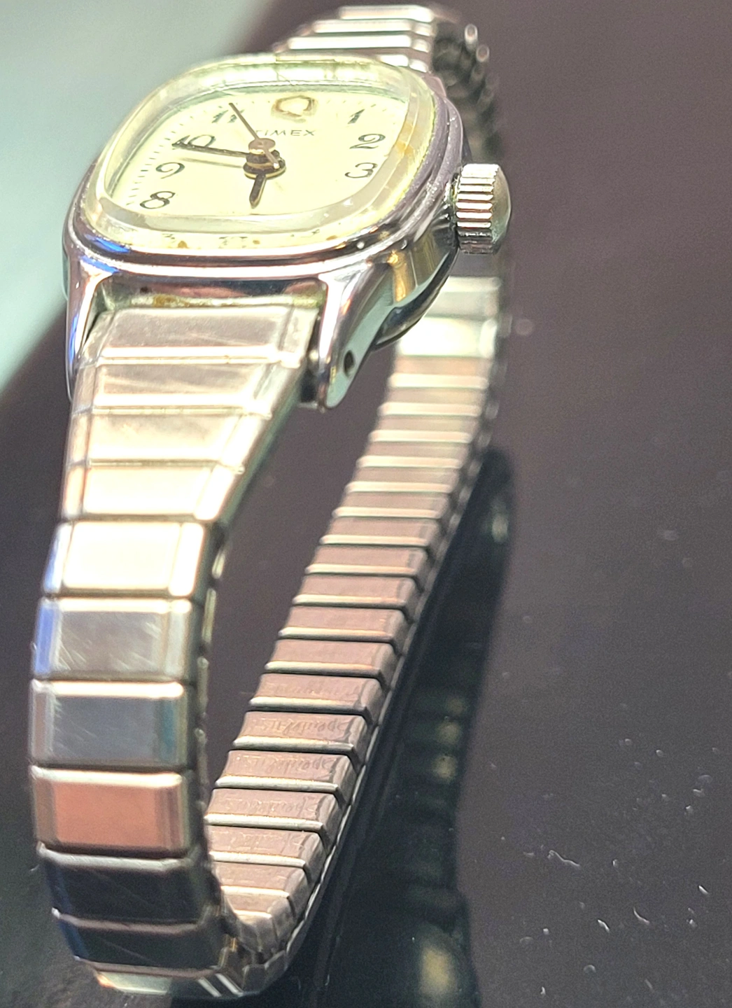 Sharp, vintage Timex Q Ladies Quartz watch in a sleek silver-tone finish. This is the classic Expansion Band that is both a timepiece and a piece of jewelry. Minimalist, durable, and ready for daily wear.