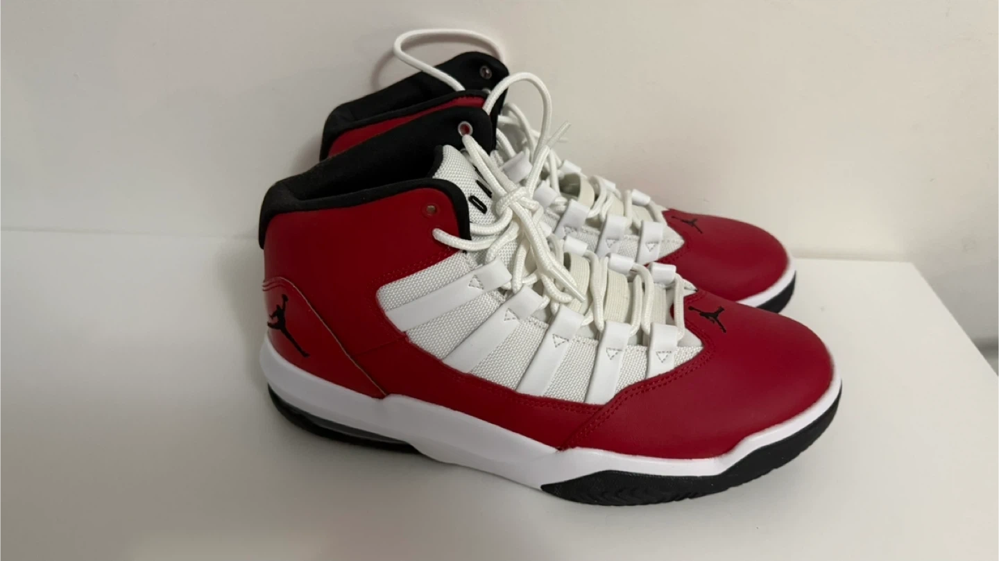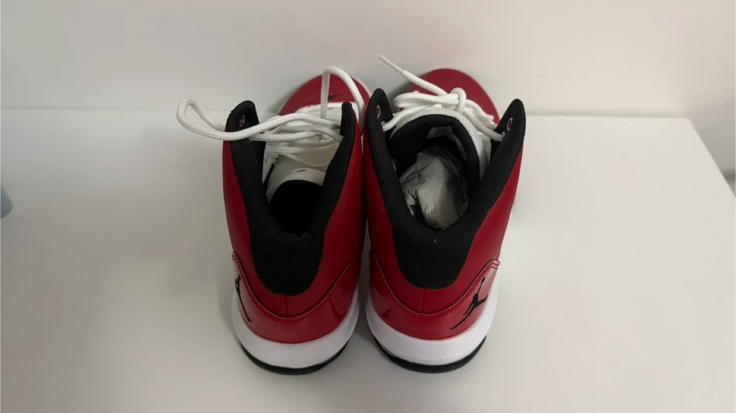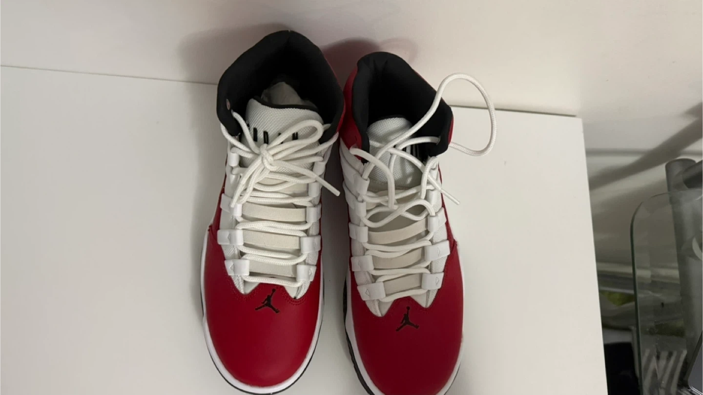 Men's high-top Jordan sneakers in red, white, and black. Lace-up closure with rubber sole. These kicks are ready for the court or casual wear!