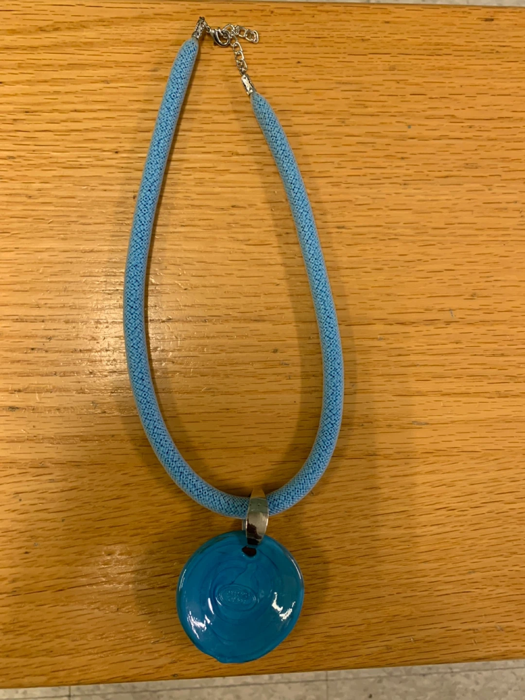 Light blue cord necklace with a round, swirled blue pendant, small beads inside. The pendant has a glossy finish and a metal clasp secures the necklace. It's a stylish accessory that adds a pop of colour to any outfit.