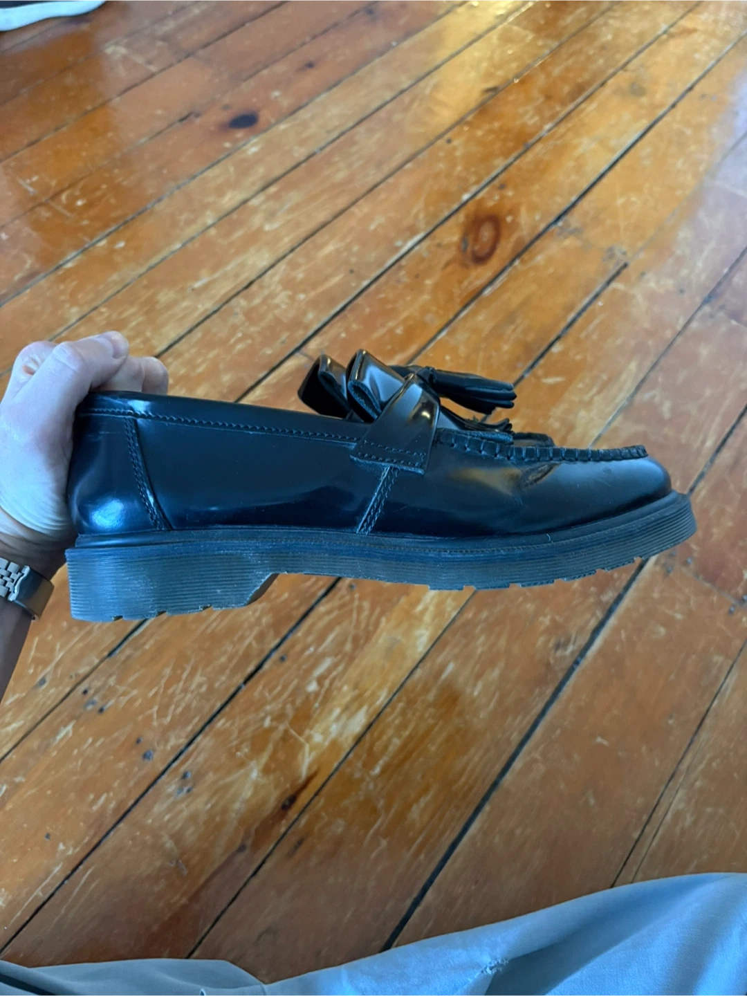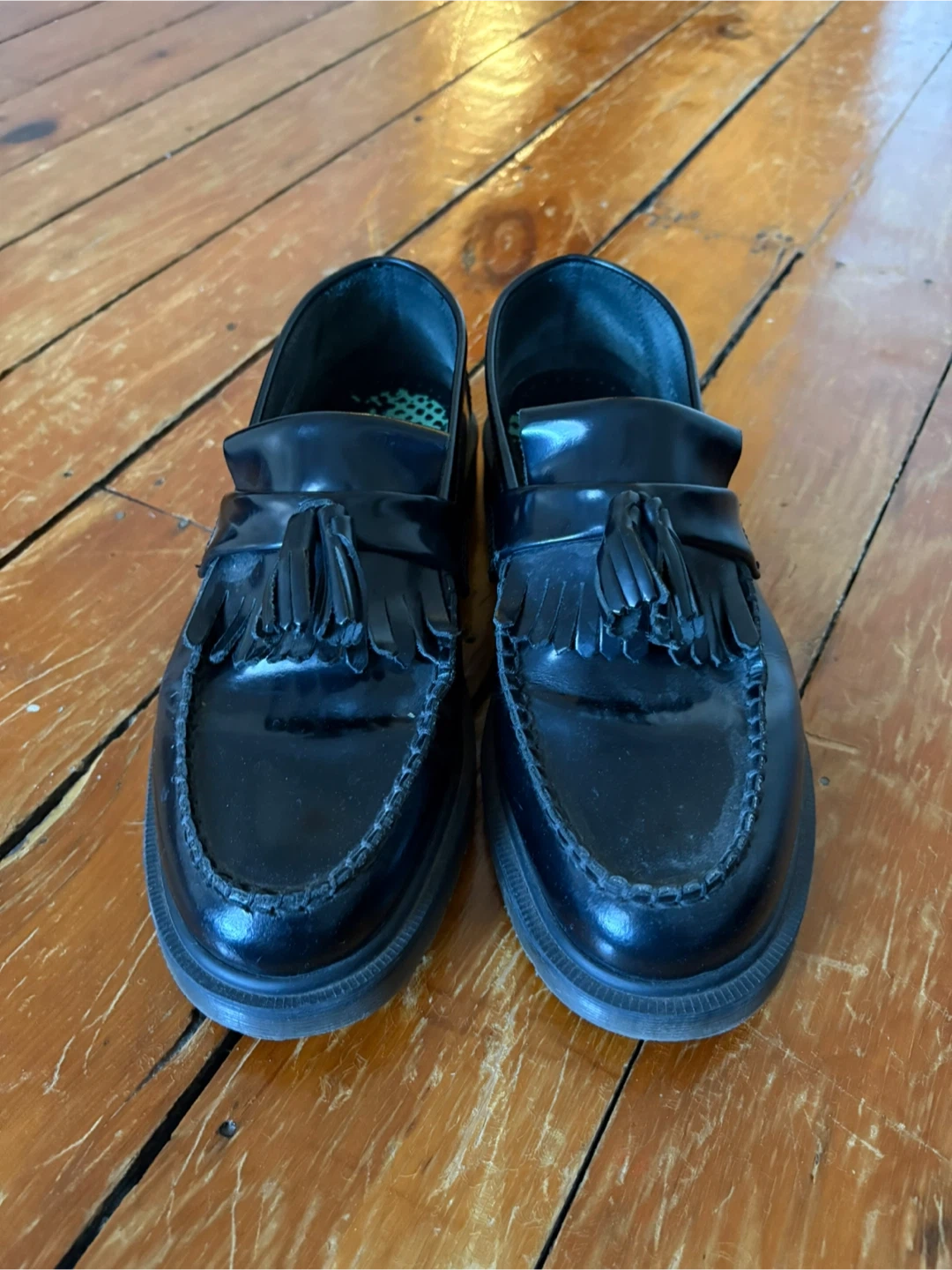 Dr. Martens black leather tassel loafers. These shoes feature a classic Goodyear welt construction. The soles are oil, fat, petrol, and alkali resistant.
