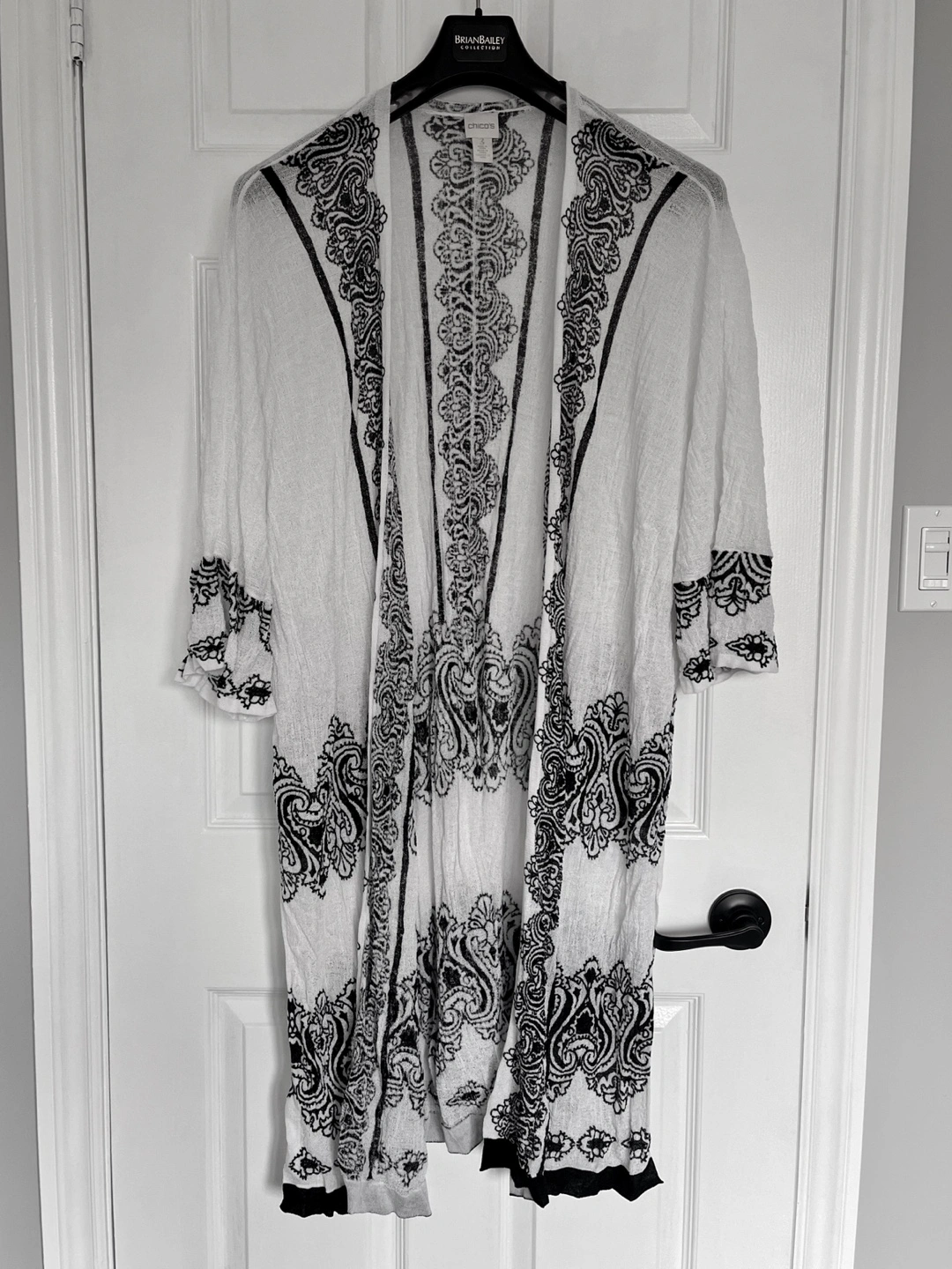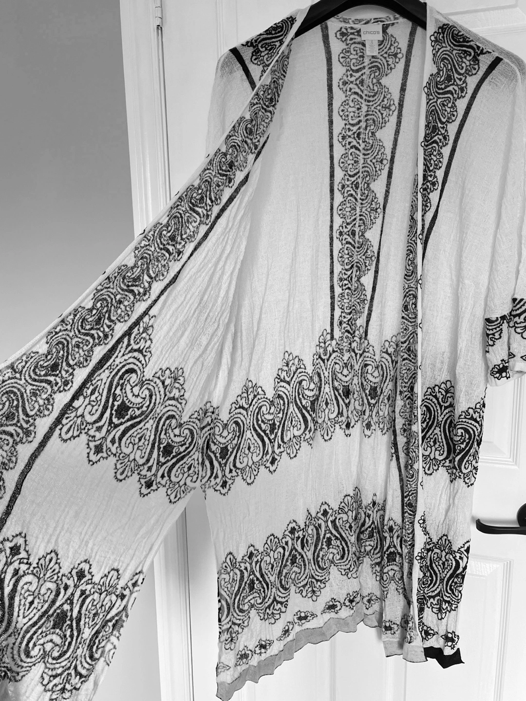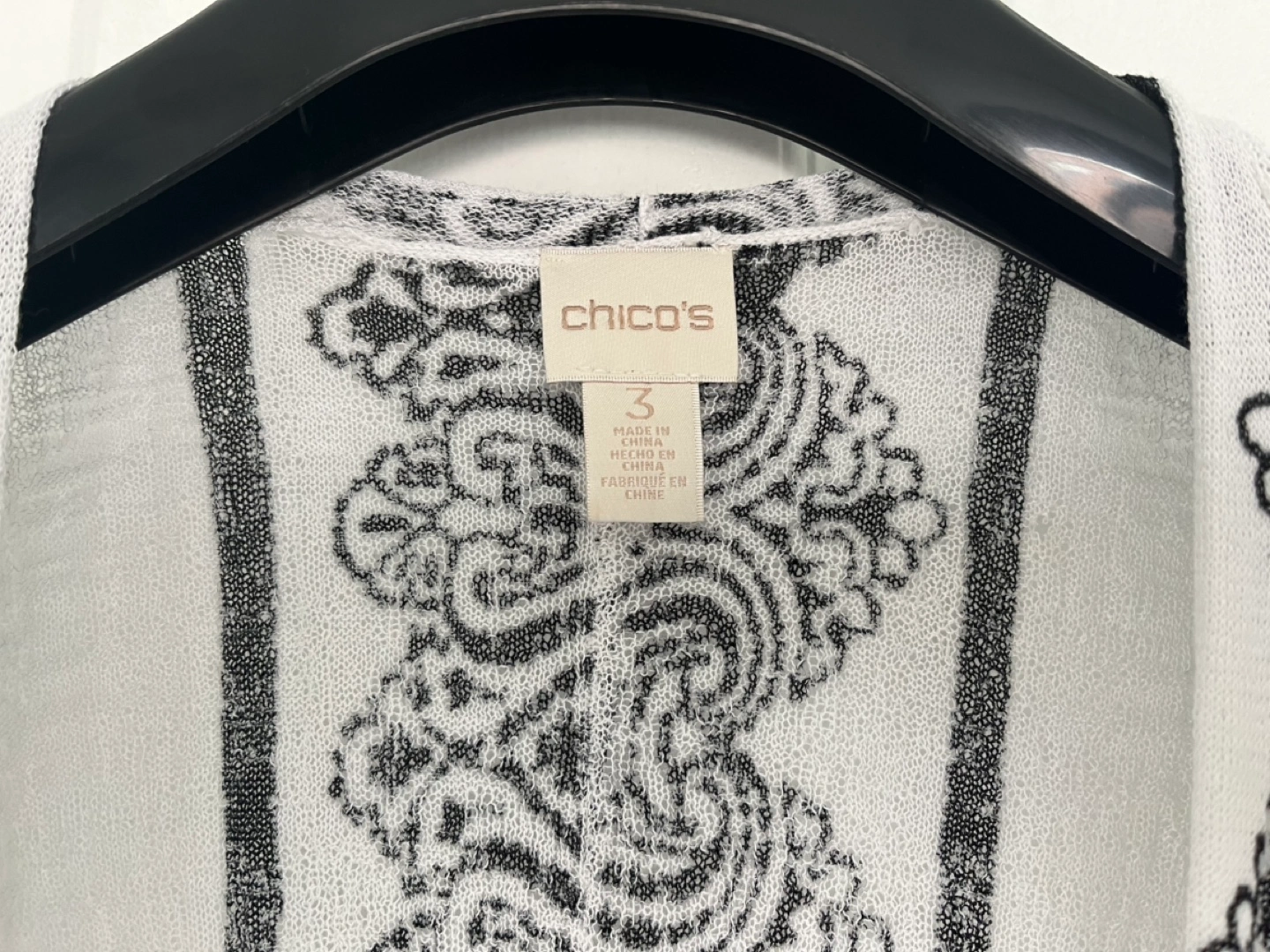 Black and white design. Lightweight textured material (87% Rayon 13% Nylon). Chico's size 3 - equivalent to US XL (please see sizing chart in photos). Smoke-free home.