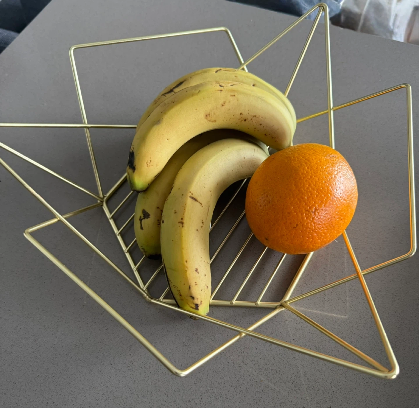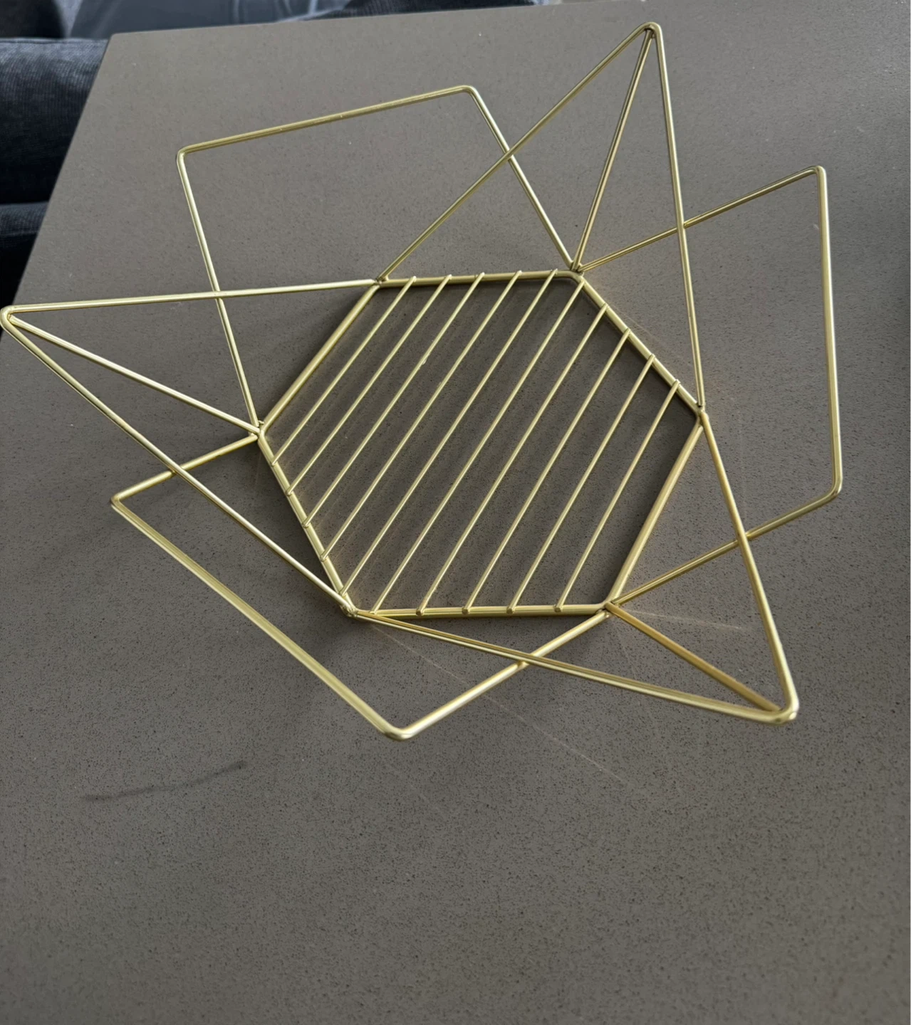 Stylish gold-tone wire fruit bowl with a modern geometric design. It's perfect for holding fruit on your countertop or table. Adds a decorative touch to any kitchen space! Light weight, fun addition to a kitchen table.