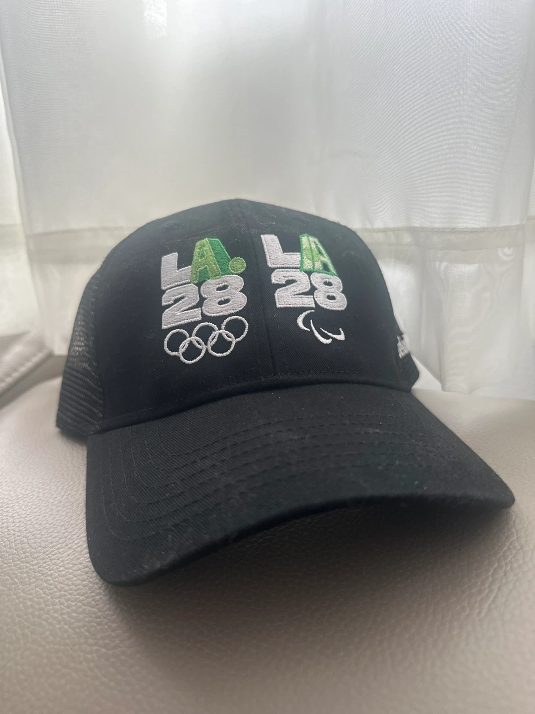 Black mesh back trucker hat with "LA 28" embroidered on the front, featuring the Olympic rings. Adjustable snapback closure for a custom fit. This hat celebrates the upcoming Los Angeles Olympics!