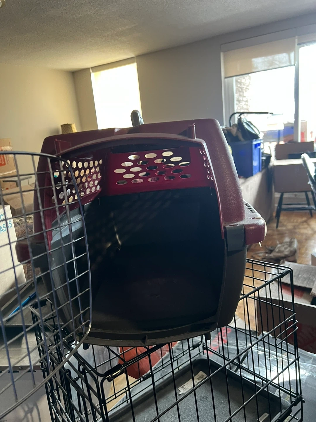 A sturdy pet carrier crate for small to medium-sized animals. It's made of durable plastic with ventilation holes for air circulation. The top handle makes it easy to carry. You must come and pick it up. There are a lot of stairs in this complex.