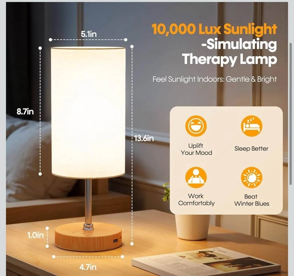 Bright table lamp with 3 color settings: warm white, natural white, and cool white. Has a USB port to charge your devices. Can be controlled with a remote. Measures 8.7 inches tall with a 5.1-inch diameter shade.