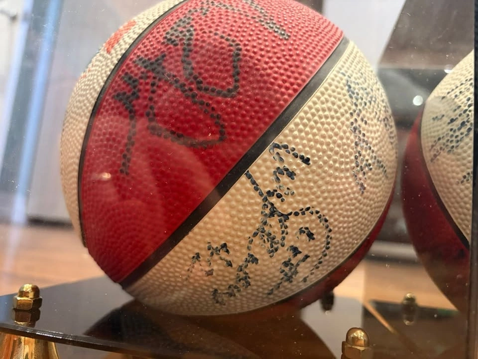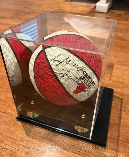 Rare 1990-91 Chicago Bulls team-signed Gatorade "Be Like Mike" promotional mini basketball from the Bulls' FIRST NBA Championship season. Displayed in a BDA Sports acrylic case with gold pedestal. Signatures include Michael Jordan, Scottie Pippen, Horace Grant, John Paxson, B.J. Armstrong, Stacey King, Will Perdue, Bill Cartwright, and possibly Craig Hodges. This ball was signed at the Bulls' post-championship celebration in 1991. A family member who worked for the Bulls organization was present and received the ball directly from players. This is not a dealer piece — it has been in one family since the night the Bulls won their first ring. Price reflects provenance and significance. Local pickup only in the Oakville, ON area. Or Best Offer.