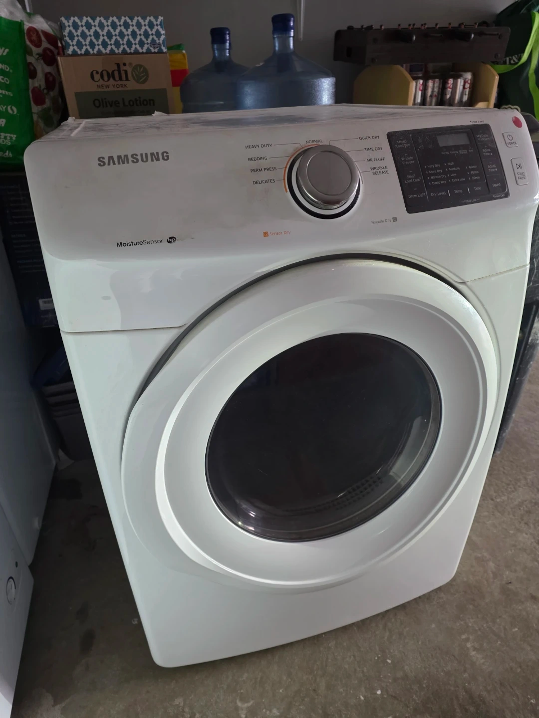 This is a white Samsung electric dryer featuring Sensor Dry technology to optimize drying cycles. It offers multiple settings including Heavy Duty, Normal, Bedding, Perm Press, Delicates, Quick Dry, Time Dry, and Air Fluff. Price is negotiable