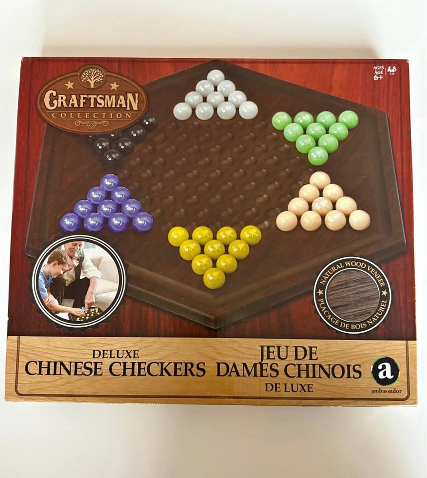 Craftsman Collection Deluxe Chinese Checkers. Great family game / classic board game. Natural wood veneer board and all marbles for a complete set. Ages 6+.