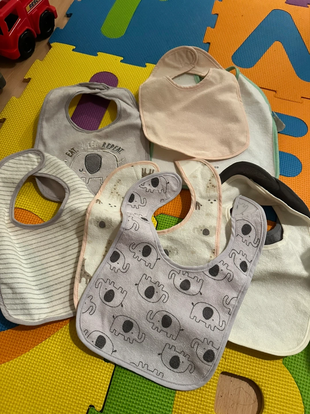 A collection of five baby bibs featuring adorable elephant patterns and a classic stripe design. Made with soft fabric for comfort during meal times. Perfect for keeping little ones clean!